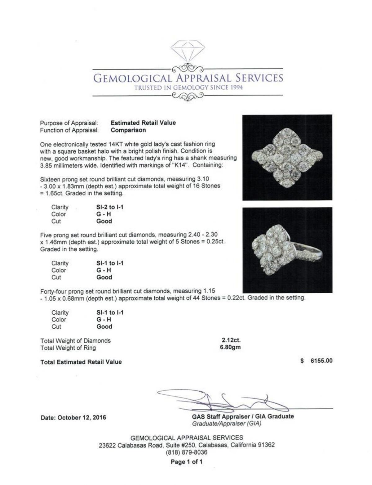 One electronically tested 14KT white gold lady's cast fashion ring with a square basket halo with a bright polish finish. The featured lady's ring has a shank measuring 3.85 millimeters wide. Identified with markings of 'K14'. Condition is new, good workmanship. Containing: Sixteen prong set round brilliant cut diamonds, measuring 3.10 - 3.00 x 1.83mm (depth est.) approximate total weight of 16 Stones = 1.65ct. Graded in the setting. Clarity SI-2 to I-1. Color: G - H Cut Good Five prong set round brilliant cut diamonds, measuring 2.40 - 2.30 x 1.46mm (depth est.) approximate total weight of 5 Stones = 0.25ct. Graded in the setting. Clarity SI-1 to I-1. Color: G - H Cut Good Forty-Four prong set round brilliant cut diamonds, measuring 1.15 - 1.05 x 0.68mm (depth est.) approximate total weight of 44 Stones = 0.22ct. Graded in the setting. Clarity SI-1 to I-1. Color: G - H Cut Good. Total Weight of Diamonds 2.12ct.. Total Weight of Ring 6.80gm. GAS Appraised.