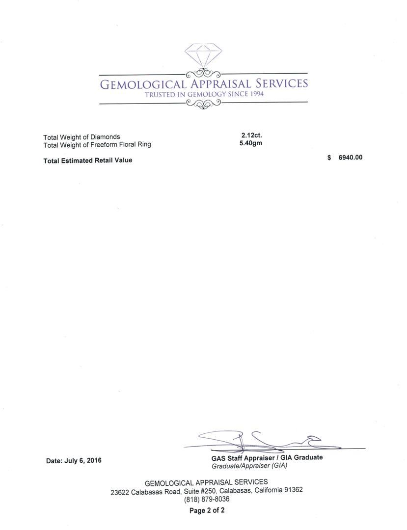 One electronically tested 14KT white and yellow gold lady's combination cast & assembled fashion freeform floral ring with a bright polish finish. The featured lady's has a shank measuring 2.62 millimeters in width. Identified with markings of "K14". Condition is new, good workmanship. Containing: Nine prong set round brilliant cut diamonds, measuring 3.00 - 2.95 x 1.86mm (depth est.) approximate total weight of 9 Stones = 0.95ct. Graded in the setting. Clarity: VS-2 to SI-1. Color: H - I. Cut Very Good Six prong set round brilliant cut diamonds, measuring 2.90 - 2.80 x 1.76mm (depth est.) approximate total weight of 6 Stones = 0.54ct. Graded in the setting. Clarity: VS-2 to SI-1. Color: H - I. Cut Very Good Six round brilliant cut diamonds, measuring 2.30 - 2.20 x 1.38mm (depth est.) approximate total weight of 6 Stones = 0.25ct. Graded in the setting. Clarity: VS-2 to SI-2. Color: G - Good Fifty-Four prong set round brilliant cut diamonds, measuring 1.30 - 1.20 x 0.76mm (depth est.) approximate total weight of 54 Stones = 0.38ct. Graded in the setting. Clarity: SI-1 to I-1. Color: H - I. Cut Good. Total Weight of Diamonds 2.12ct. Total Weight of Freeform Floral Ring 5.40gm. GAS Appraised.
