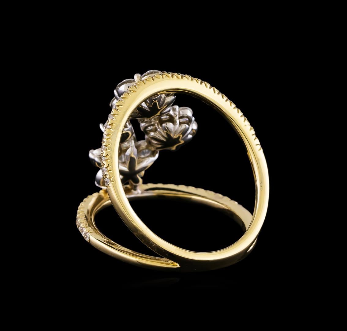 One electronically tested 14KT white and yellow gold lady's combination cast & assembled fashion freeform floral ring with a bright polish finish. The featured lady's has a shank measuring 2.62 millimeters in width. Identified with markings of "K14". Condition is new, good workmanship. Containing: Nine prong set round brilliant cut diamonds, measuring 3.00 - 2.95 x 1.86mm (depth est.) approximate total weight of 9 Stones = 0.95ct. Graded in the setting. Clarity: VS-2 to SI-1. Color: H - I. Cut Very Good Six prong set round brilliant cut diamonds, measuring 2.90 - 2.80 x 1.76mm (depth est.) approximate total weight of 6 Stones = 0.54ct. Graded in the setting. Clarity: VS-2 to SI-1. Color: H - I. Cut Very Good Six round brilliant cut diamonds, measuring 2.30 - 2.20 x 1.38mm (depth est.) approximate total weight of 6 Stones = 0.25ct. Graded in the setting. Clarity: VS-2 to SI-2. Color: G - Good Fifty-Four prong set round brilliant cut diamonds, measuring 1.30 - 1.20 x 0.76mm (depth est.) approximate total weight of 54 Stones = 0.38ct. Graded in the setting. Clarity: SI-1 to I-1. Color: H - I. Cut Good. Total Weight of Diamonds 2.12ct. Total Weight of Freeform Floral Ring 5.40gm. GAS Appraised.