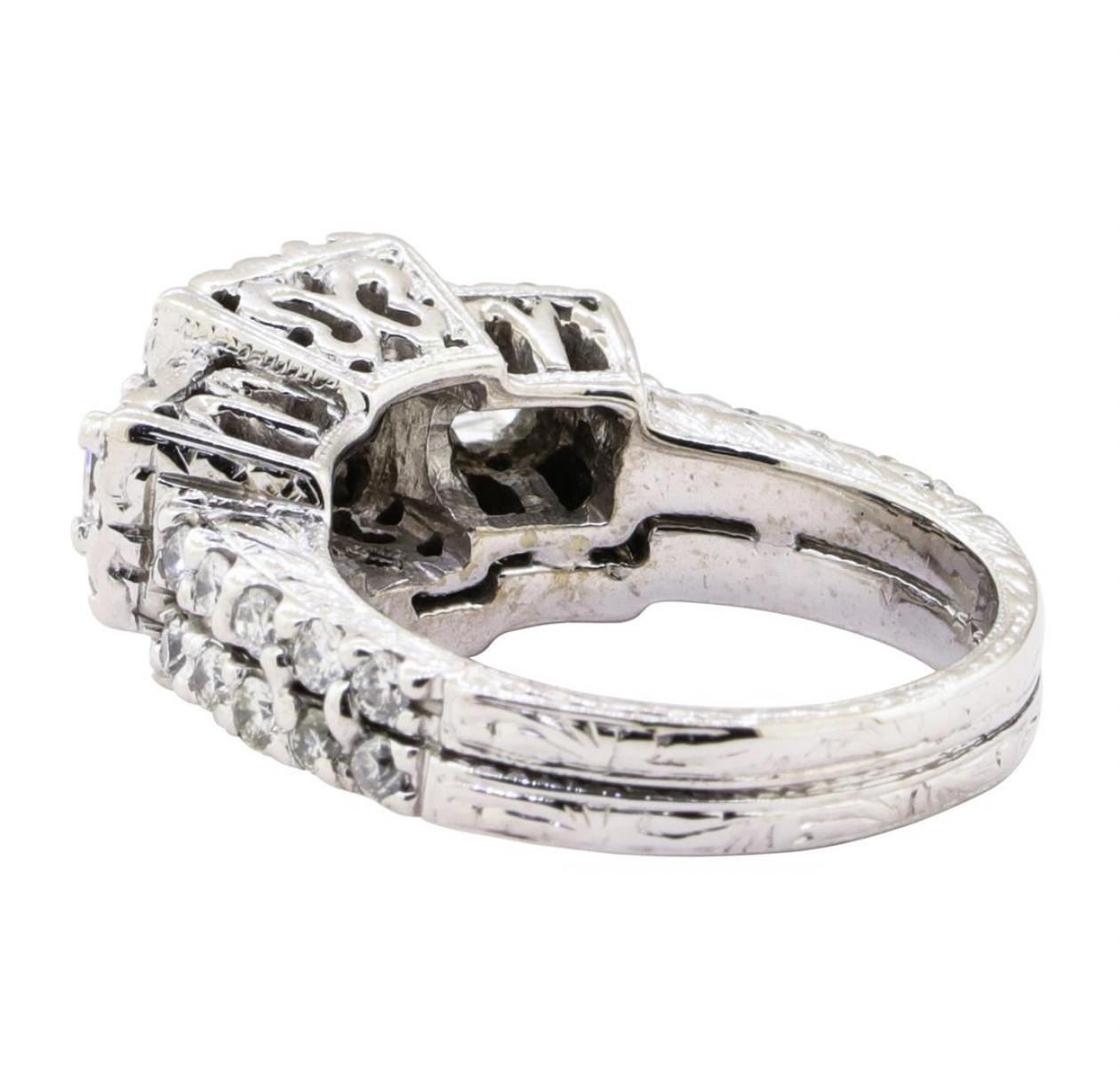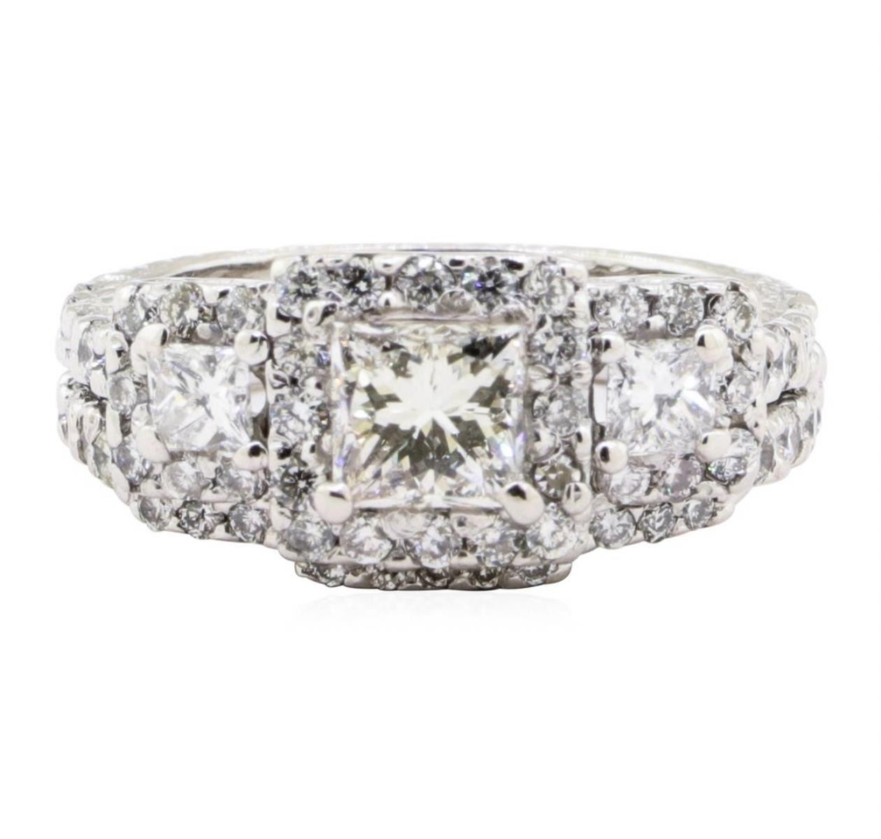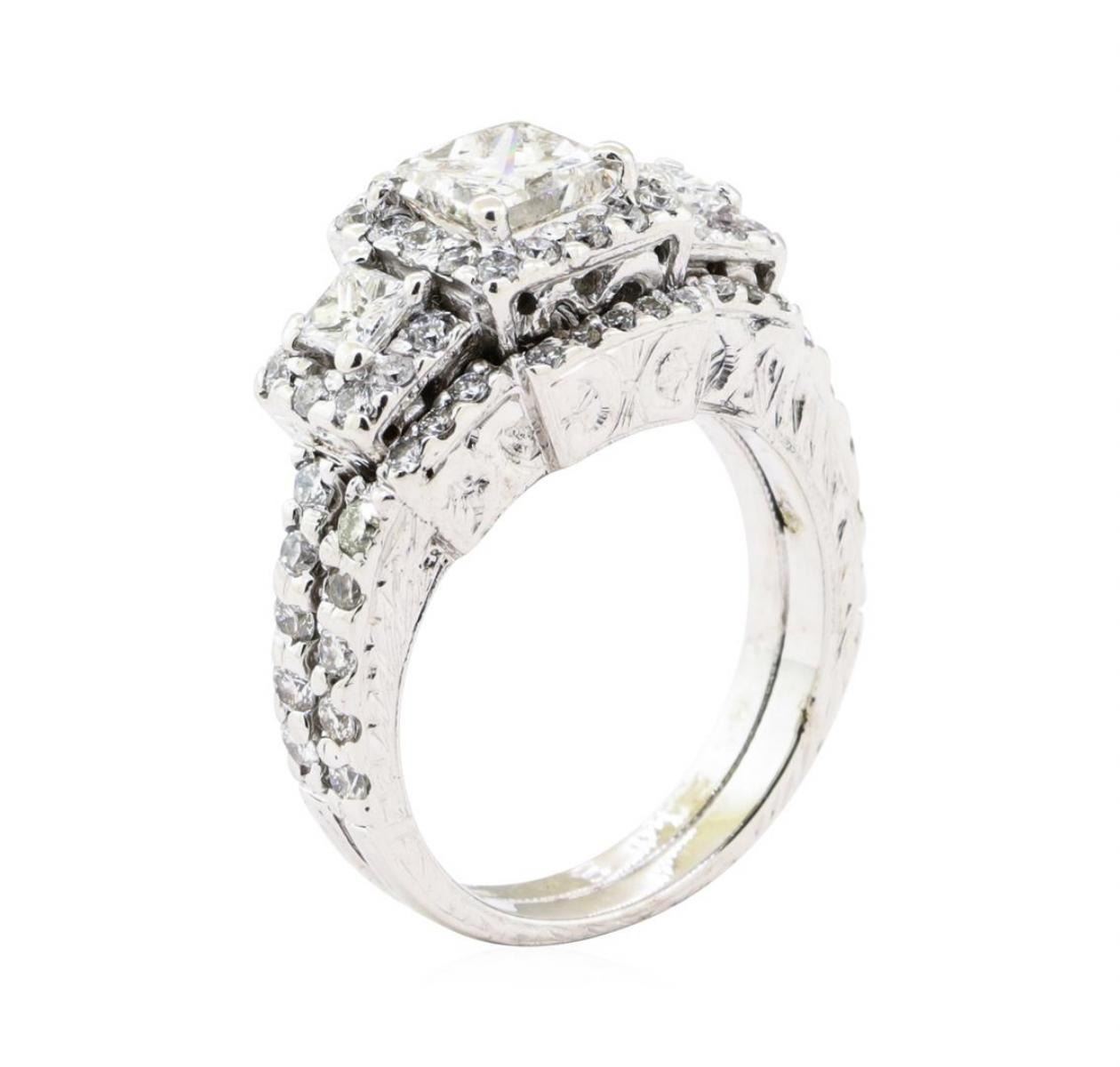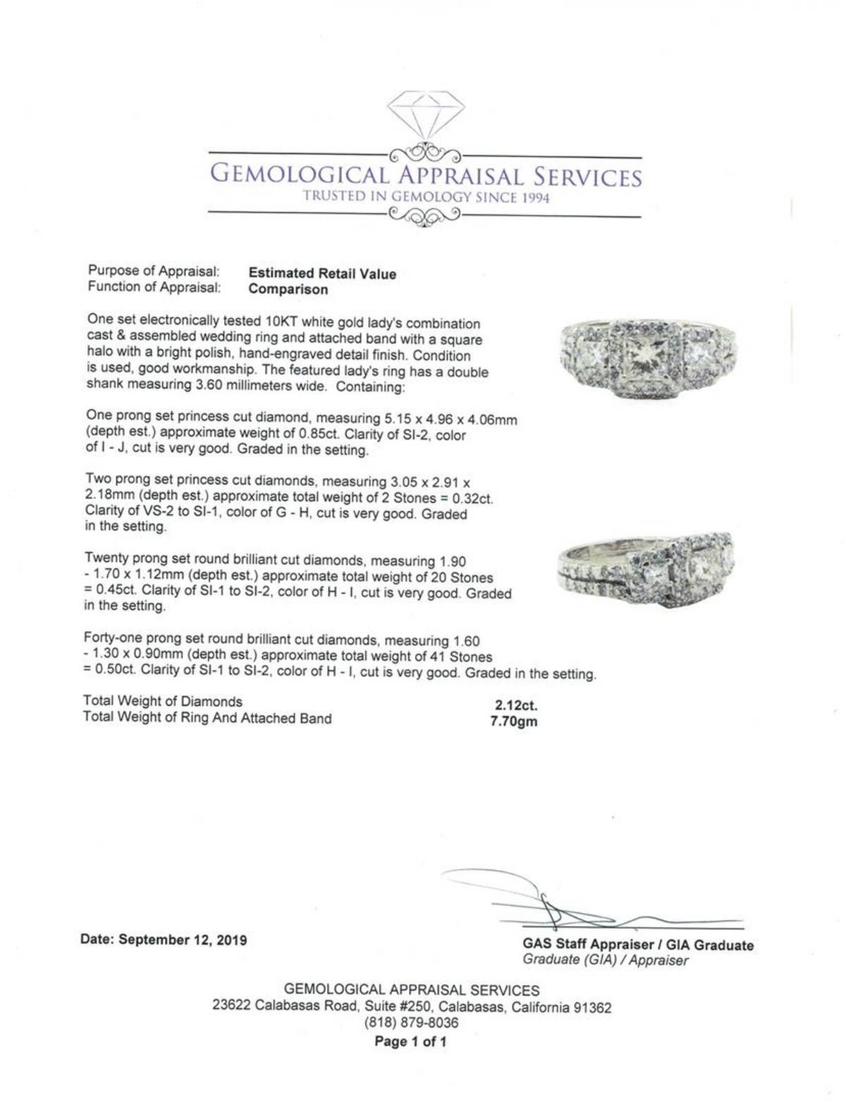 One set electronically tested 10KT white gold lady's combination cast & assembled wedding ring and attached band with a square halo with a bright polish, hand-engraved detail finish. The featured lady's ring has a double shank measuring 3.60 millimeters wide. Condition is used, good workmanship. Containing: One prong set princess cut diamond, measuring 5.15 x 4.96 x 4.06mm (depth est.) approximate weight of 0.85ct. Graded in the setting. Color I - J Clarity SI-2 Cut Very Good Two prong set princess cut diamonds, measuring 3.05 x 2.91 x 2.18mm (depth est.) approximate total weight of 2 Stones = 0.32ct. Graded in the setting. Color G - H Clarity VS-2 to SI-1 Cut Very Good Twenty prong set round brilliant cut diamonds, measuring 1.90 - 1.70 x 1.12mm (depth est.) approximate total weight of 20 Stones = 0.45ct. Graded in the setting. Color H - I Clarity SI-1 to SI-2 Cut Very Good Forty-One prong set round brilliant cut diamonds, measuring 1.60 - 1.30 x 0.90mm (depth est.) approximate total weight of 41 Stones = 0.50ct. Graded in the setting. Color H - I Clarity SI-1 to SI-2 Cut Very Good. Total Weight of Diamonds 2.12ct.. Total Weight of Ring And Attached Band 7.70gm GAS Appraised at $8530.00. GAS Appraised.