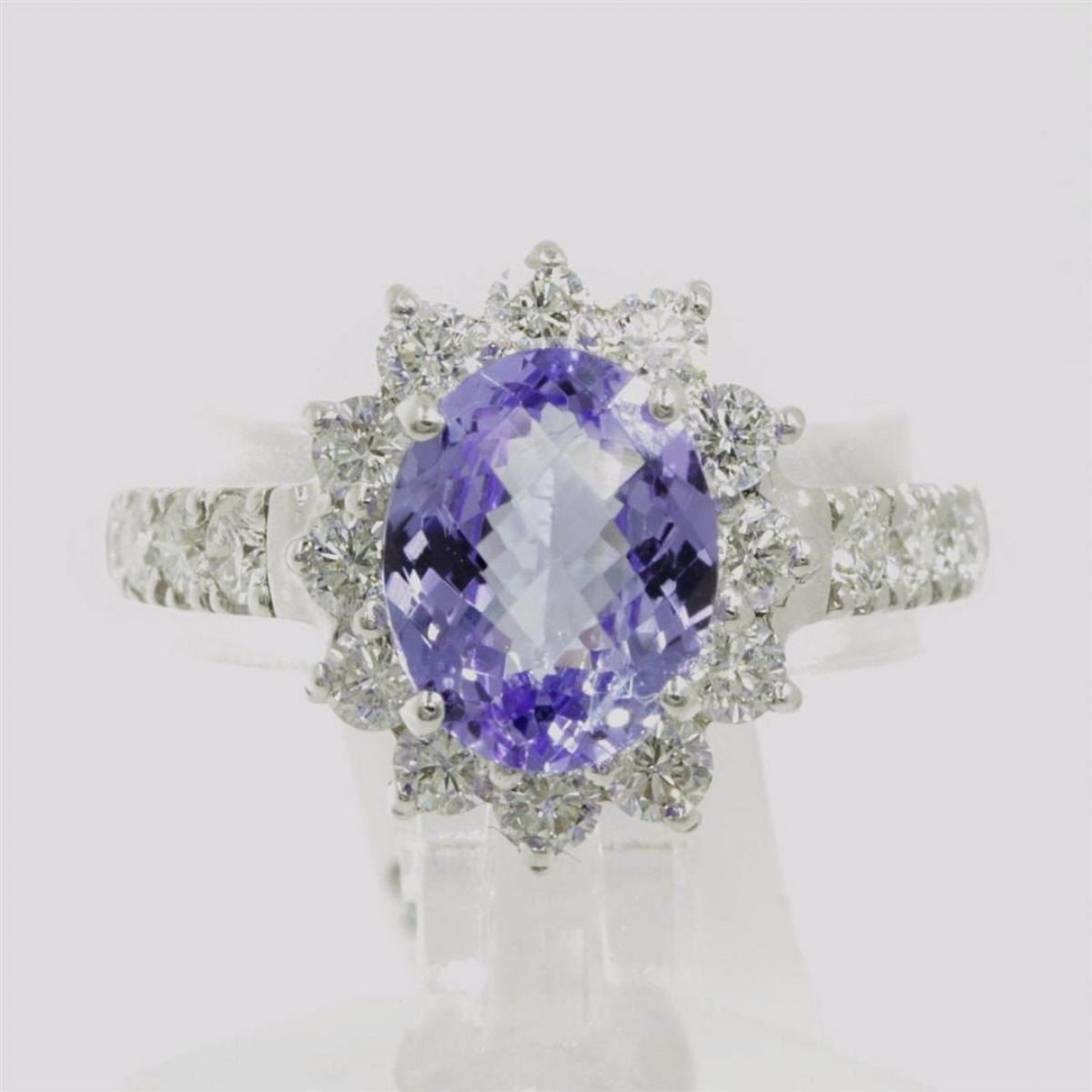 One ring featuring: 14KT white gold weighing 4.16 grams containing one tanzanite weighing 2.12ct and 24 diamonds weighing 1.14ctw. The tanzanite is oval shape with fine clarity and medium blue color with very good cut. The diamonds are round brilliant cut and are natural, unenhanced stones with SI-1 clarity, G-H color and very good cut. The ring is a size 6.5 but is resizable.