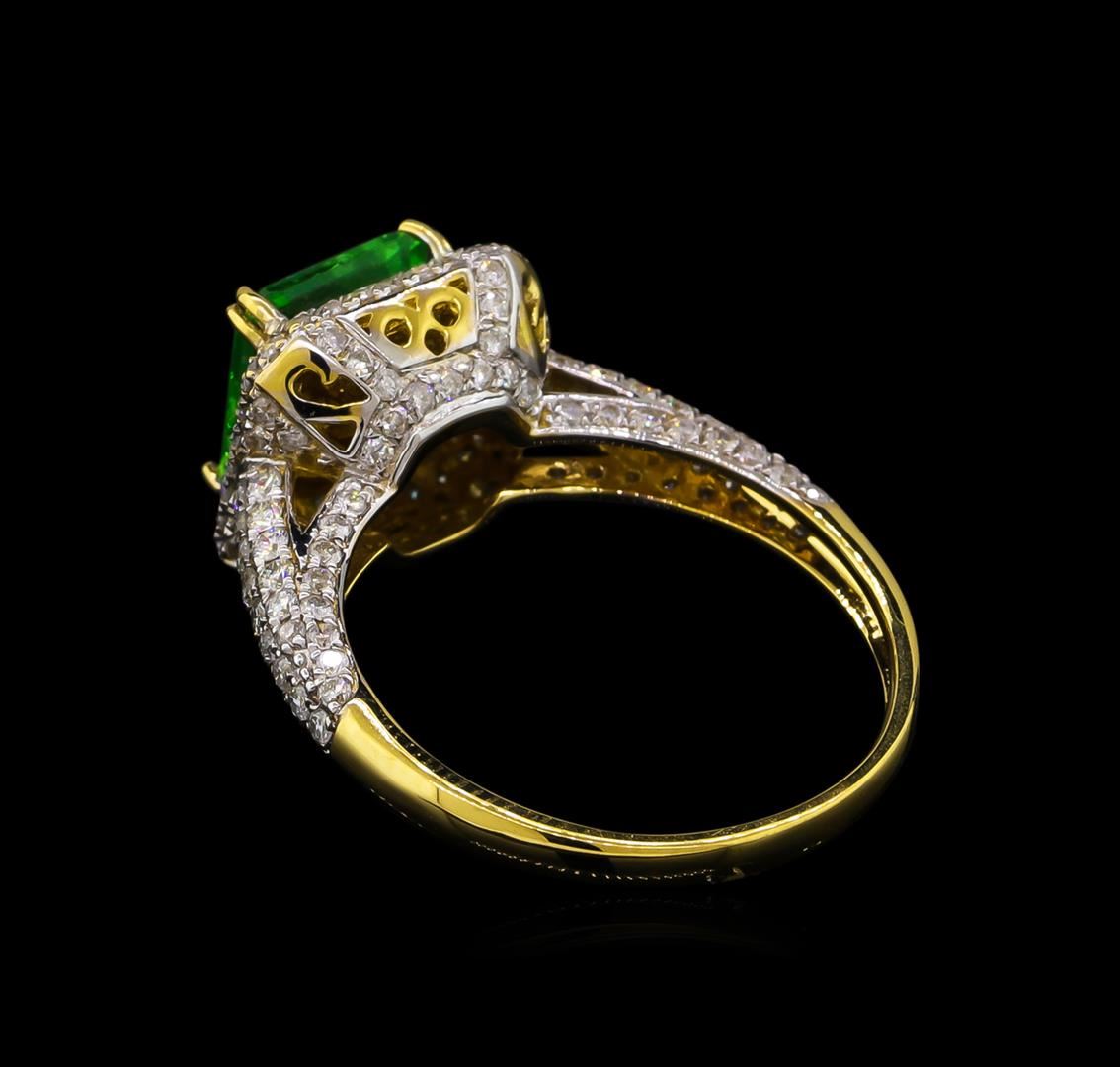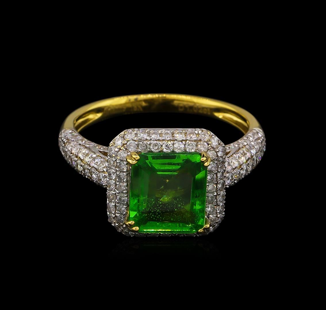 One electronically tested 18KT yellow gold lady's cast fashion ring with a cathedral halo with a bright polish finish. The featured lady's ring has a shank measuring 2.01 millimeters wide. Trademark is Orianne. Identified with markings of "18K". Condition is new, good workmanship. Containing: One prong set emerald step cut natural tsavorite garnet, measuring 8.42 x 7.41 x 3.47mm, approximate weight of 2.12ct., clarity is slightly included, type II, medium dark, moderately strong, slightly yellowish green color, (GIA slyG 6/4), cut is good. Transmitting light with a minimum of distortion, transparent. Colored gemstones are presumed to have been subjected to commonly used enhancement processes. Graded in the setting. One Hundred Fifty prong set round brilliant cut diamonds, measuring 1.30 - 1.20 x 0.75mm (depth est.) approximate total weight of 150 Stones = 1.06ct. Graded in the setting. Clarity: SI-1 to I-1. Color: H - I. Cut Good. Total Weight of Colored Stones 2.12ct. Total Weight of Diamonds 1.06ct. Total Weight of Ring 4.80gm. GAS Appraised at $9,315.00.
