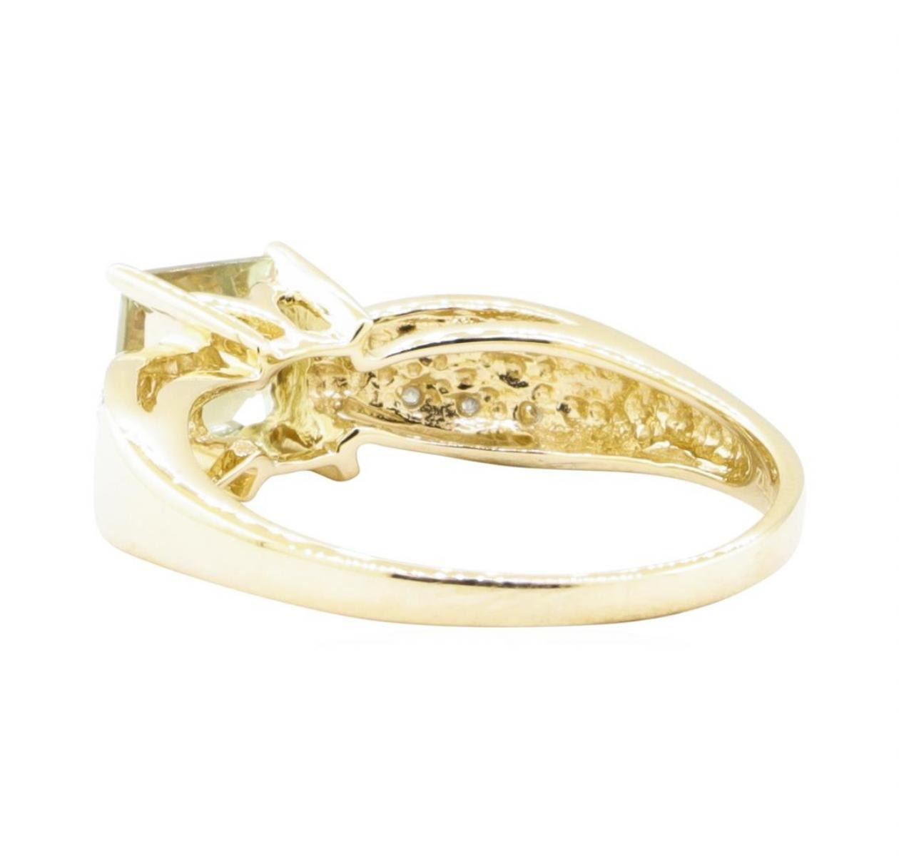 One electronically tested 14KT yellow gold lady's cast fashion ring with a crossover shank with a bright polish finish. The featured lady's ring has a shank measuring 1.80 millimeters in width. Identified with markings of '14K'. Condition is Good. Containing: One prong set square modified brilliant cut natural zultanite, measuring 6.20 x 6.16 x 4.00mm, (depth est.) approximate weight of 2.00 ct., clarity is eye clean, medium, moderately strong, yellowish green color, (GIA yG 5/4), cut is very good. Color change to reddish-green. Colored gemstones are presumed to have been subjected to commonly used enhancement processes. Transmitting light with no distortion, transparent. Graded in the setting. Fourteen prong set round brilliant cut diamonds, measuring 1.30 - 1.25 x 0.77mm (depth est.) approximate total weight of 14 Stones = 0.12ct. Graded in the setting. Color H - I Clarity SI-2 to I-2 Cut Good. Total Weight of Colored Stones 2.00 ct.. Total Weight of Diamonds 0.12ct.. Total Weight of Ring 3.70gm GAS Appraised at $970.00. GAS Appraised.