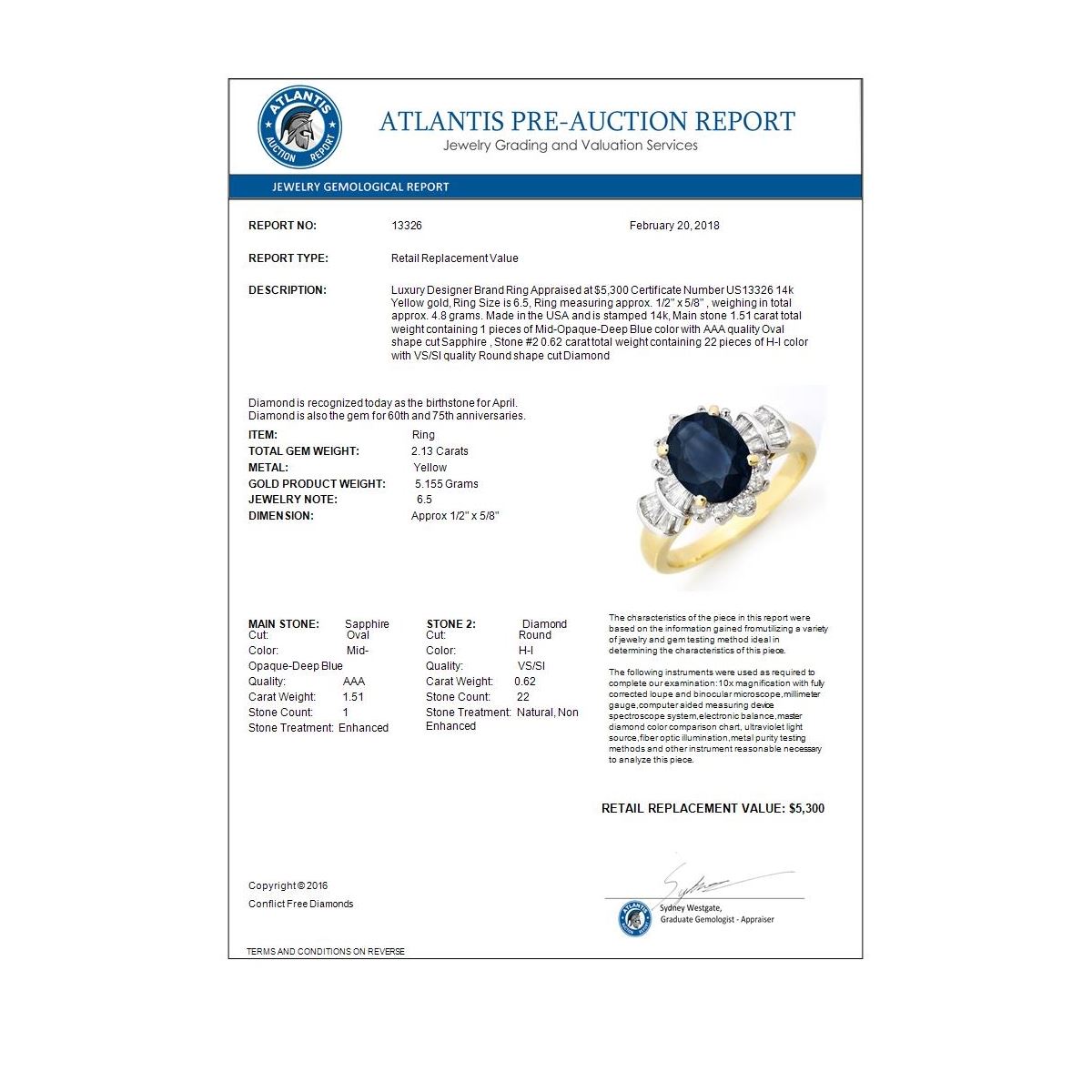 REF-80F2N -13326 ---- 2.13 CTW Blue Sapphire & Diamond Ring 14K Yellow Gold ---- Luxury Designer Brand Ring Appraised at $5,300 Certificate Number US13326 14k Yellow gold, Ring Size is 6.5, Ring measuring approx. 1/2" x 5/8" , weighing in total approx. 4.8 grams. Made in the USA and is stamped 14k, Main stone 1.51 carat total weight containing 1 pieces of Mid-Opaque-Deep Blue color with AAA quality Oval shape cut Sapphire , Stone #2 0.62 carat total weight containing 22 pieces of H-I color with VS/SI quality Round shape cut Diamond