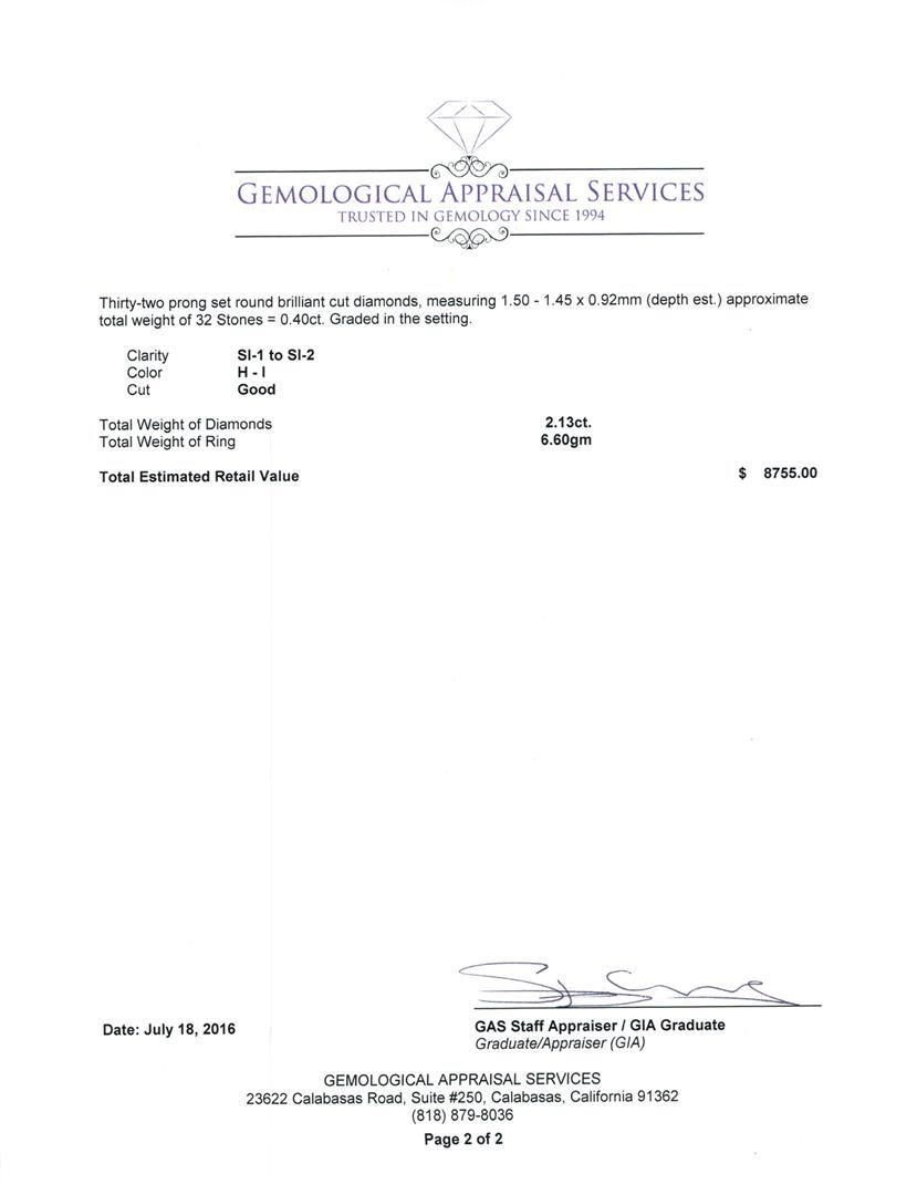 One electronically tested 14KT white gold lady's cast wedding ring with a basket halo with a bright polish finish. The featured lady's ring has a shank measuring 3.84 millimeters wide. Identified with markings of '585'. Condition is new, good workmanship. Containing: One prong set round brilliant cut diamond, measuring 5.15 - 5.11 x 3.08mm (depth est.) approximate weight of 0.50ct. Graded in the setting. Clarity SI-1. Color: H Cut Very Good Four prong set round brilliant cut diamonds, measuring 3.20 - 3.05 x 1.94mm (depth est.) approximate total weight of 4 Stones = 0.46ct. Graded in the setting. Clarity VS-2 to SI-1. Color: I - J Cut Good Four prong set round brilliant cut diamonds, measuring 2.70 - 2.40 x 1.58mm (depth est.) approximate total weight of 4 Stones = 0.28ct. Graded in the setting. Clarity SI-1 to SI-2. Color: G - I Cut Good Ten prong set round brilliant cut diamonds, measuring 2.40 - 2.30 x 1.46mm (depth est.) approximate total weight of 10 Stones = 0.49ct. Graded in the setting. Clarity SI-1 to SI-2. Color: H - I Cut Good Thirty-Two prong set round brilliant cut diamonds, measuring 1.50 - 1.45 x 0.92mm (depth est.) approximate total weight of 32 Stones = 0.40ct. Graded in the setting. Clarity SI-1 to SI-2. Color: H - I Cut Good. Total Weight of Diamonds 2.13ct.. Total Weight of Ring 6.60gm. GAS Appraised at $8,755.00.