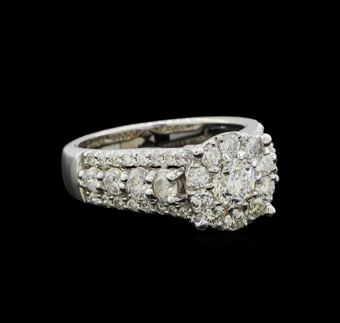 One electronically tested 14KT white gold lady's cast wedding ring with a basket halo with a bright polish finish. The featured lady's ring has a shank measuring 3.84 millimeters wide. Identified with markings of '585'. Condition is new, good workmanship. Containing: One prong set round brilliant cut diamond, measuring 5.15 - 5.11 x 3.08mm (depth est.) approximate weight of 0.50ct. Graded in the setting. Clarity SI-1. Color: H Cut Very Good Four prong set round brilliant cut diamonds, measuring 3.20 - 3.05 x 1.94mm (depth est.) approximate total weight of 4 Stones = 0.46ct. Graded in the setting. Clarity VS-2 to SI-1. Color: I - J Cut Good Four prong set round brilliant cut diamonds, measuring 2.70 - 2.40 x 1.58mm (depth est.) approximate total weight of 4 Stones = 0.28ct. Graded in the setting. Clarity SI-1 to SI-2. Color: G - I Cut Good Ten prong set round brilliant cut diamonds, measuring 2.40 - 2.30 x 1.46mm (depth est.) approximate total weight of 10 Stones = 0.49ct. Graded in the setting. Clarity SI-1 to SI-2. Color: H - I Cut Good Thirty-Two prong set round brilliant cut diamonds, measuring 1.50 - 1.45 x 0.92mm (depth est.) approximate total weight of 32 Stones = 0.40ct. Graded in the setting. Clarity SI-1 to SI-2. Color: H - I Cut Good. Total Weight of Diamonds 2.13ct.. Total Weight of Ring 6.60gm. GAS Appraised at $8,755.00.
