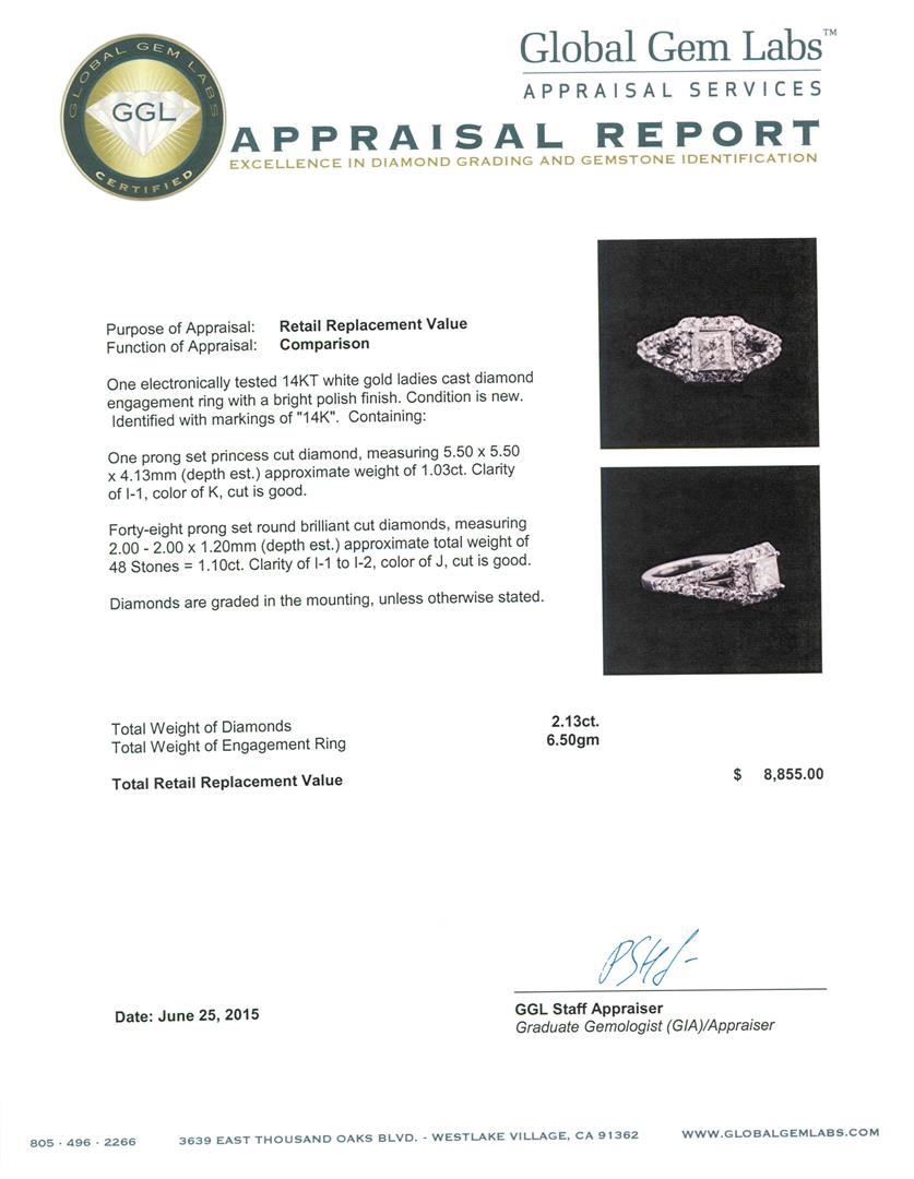 One electronically tested 14KT white gold ladies cast diamond engagement ring with a bright polish finish. Identified with markings of "14K". Condition is new. Containing: One prong set princess cut diamond, measuring 5.50 x 5.50 x 4.13mm (depth est.) approximate weight of 1.03ct. Clarity: I-1. Color: K, Cut is Good. Forty-Eight prong set round brilliant cut diamonds, measuring 2.00 - 2.00 x 1.20mm (depth est.) approximate total weight of 48 Stones = 1.10ct. Clarity: I-1 to I-2. Color: J, Cut is Good. Diamonds are graded in the mounting, unless otherwise stated. Total Weight of Diamonds 2.13ct. Total Weight of Engagement Ring 6.50 grams. GGL Appraised at $8,855.00.