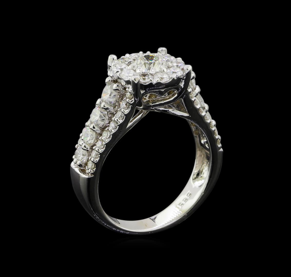 One electronically tested 14KT white gold lady's cast wedding ring with a basket halo with a bright polish finish. The featured lady's ring has a shank measuring 3.84 millimeters wide. Identified with markings of '585'. Condition is new, good workmanship. Containing: One prong set round brilliant cut diamond, measuring 5.15 - 5.11 x 3.08mm (depth est.) approximate weight of 0.50ct. Graded in the setting. Clarity SI-1. Color: H Cut Very Good Four prong set round brilliant cut diamonds, measuring 3.20 - 3.05 x 1.94mm (depth est.) approximate total weight of 4 Stones = 0.46ct. Graded in the setting. Clarity VS-2 to SI-1. Color: I - J Cut Good Four prong set round brilliant cut diamonds, measuring 2.70 - 2.40 x 1.58mm (depth est.) approximate total weight of 4 Stones = 0.28ct. Graded in the setting. Clarity SI-1 to SI-2. Color: G - I Cut Good Ten prong set round brilliant cut diamonds, measuring 2.40 - 2.30 x 1.46mm (depth est.) approximate total weight of 10 Stones = 0.49ct. Graded in the setting. Clarity SI-1 to SI-2. Color: H - I Cut Good Thirty-Two prong set round brilliant cut diamonds, measuring 1.50 - 1.45 x 0.92mm (depth est.) approximate total weight of 32 Stones = 0.40ct. Graded in the setting. Clarity SI-1 to SI-2. Color: H - I Cut Good. Total Weight of Diamonds 2.13ct.. Total Weight of Ring 6.60gm. GAS Appraised.