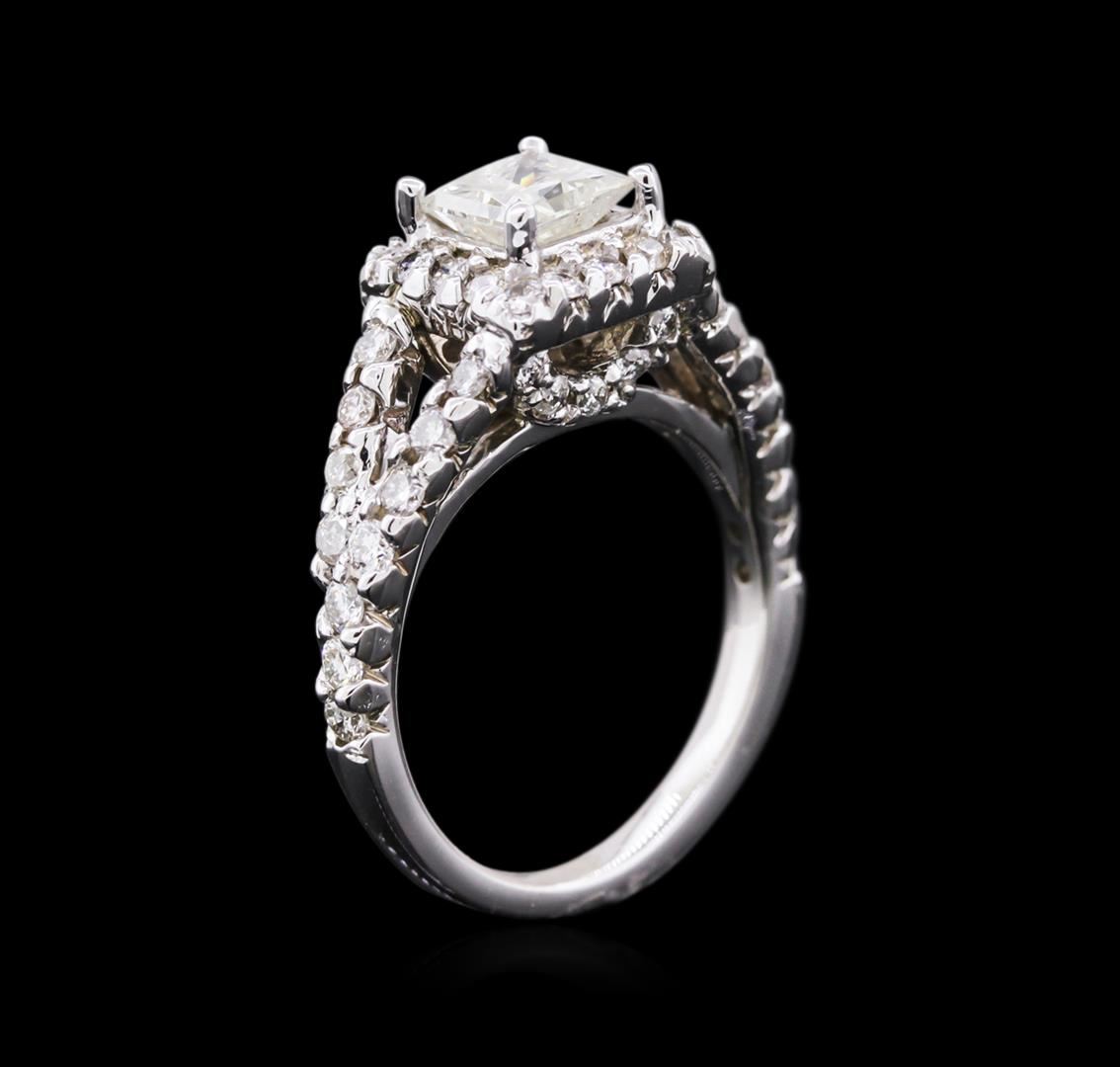 One electronically tested 14KT white gold ladies cast diamond engagement ring with a bright polish finish. Identified with markings of "14K". Condition is new. Containing: One prong set princess cut diamond, measuring 5.50 x 5.50 x 4.13mm (depth est.) approximate weight of 1.03ct. Clarity: I-1. Color: K, Cut is Good. Forty-Eight prong set round brilliant cut diamonds, measuring 2.00 - 2.00 x 1.20mm (depth est.) approximate total weight of 48 Stones = 1.10 ct. Clarity: I-1 to I-2. Color: J, Cut is Good. Diamonds are graded in the mounting, unless otherwise stated. Total Weight of Diamonds 2.13ct. Total Weight of Engagement Ring 6.50 grams. GGL Appraised.