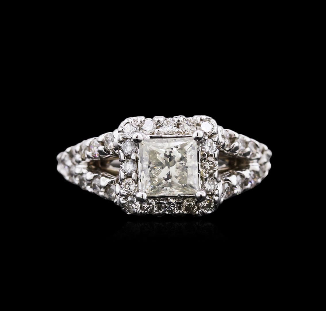 One electronically tested 14KT white gold ladies cast diamond engagement ring with a bright polish finish. Identified with markings of "14K". Condition is new. Containing: One prong set princess cut diamond, measuring 5.50 x 5.50 x 4.13mm (depth est.) approximate weight of 1.03ct. Clarity: I-1. Color: K, Cut is Good. Forty-Eight prong set round brilliant cut diamonds, measuring 2.00 - 2.00 x 1.20mm (depth est.) approximate total weight of 48 Stones = 1.10 ct. Clarity: I-1 to I-2. Color: J, Cut is Good. Diamonds are graded in the mounting, unless otherwise stated. Total Weight of Diamonds 2.13ct. Total Weight of Engagement Ring 6.50 grams. GGL Appraised.