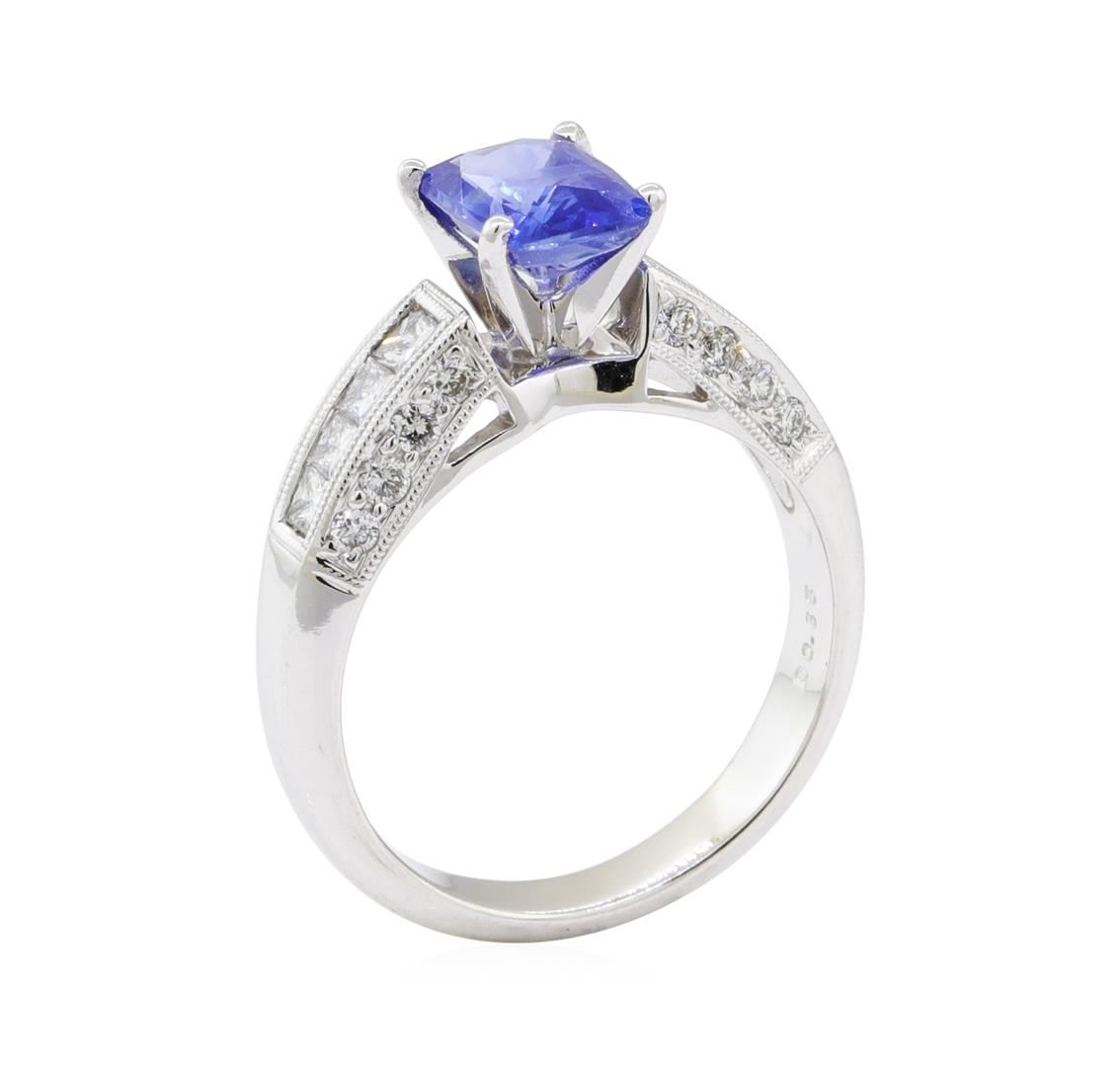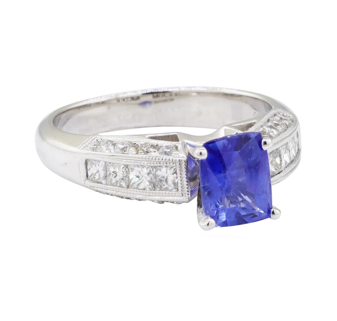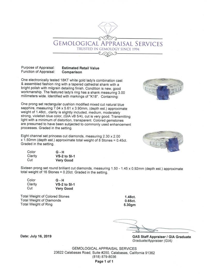 One electronically tested 18KT white gold lady's combination cast & assembled fashion ring with a tapered cathedral shank with a bright polish with milgrain detailing finish. The featured lady's ring has a shank measuring 3.00 millimeters wide. Identified with markings of 'K18'. Condition is new, good workmanship. Containing: One prong set rectangular cushion modified mixed cut natural blue sapphire, measuring 7.04 x 5.61 x 3.90mm, (depth est.) approximate weight of 1.48ct., clarity is slightly included, medium, moderately strong, violetish blue color, (GIA vB 5/4), cut is very good. Transmitting light with a minimum of distortion, transparent. Colored gemstones are presumed to have been subjected to commonly used enhancement processes. Graded in the setting. Eight channel set princess cut diamonds, measuring 2.30 x 2.00 x 1.50mm (depth est.) approximate total weight of 8 Stones = 0.45ct. Graded in the setting. Color G - H Clarity VS-2 to SI-1 Cut Very Good Sixteen prong set round brilliant cut diamonds, measuring 1.50 - 1.45 x 0.92mm (depth est.) approximate total weight of 16 Stones = 0.20ct. Graded in the setting. Color G - H Clarity VS-2 to SI-1 Cut Very Good. Total Weight of Colored Stones 1.48ct.. Total Weight of Diamonds 0.65ct.. Total Weight of Ring 5.30gm GAS Appraised at $4935.00. GAS Appraised at $4,140.00.
