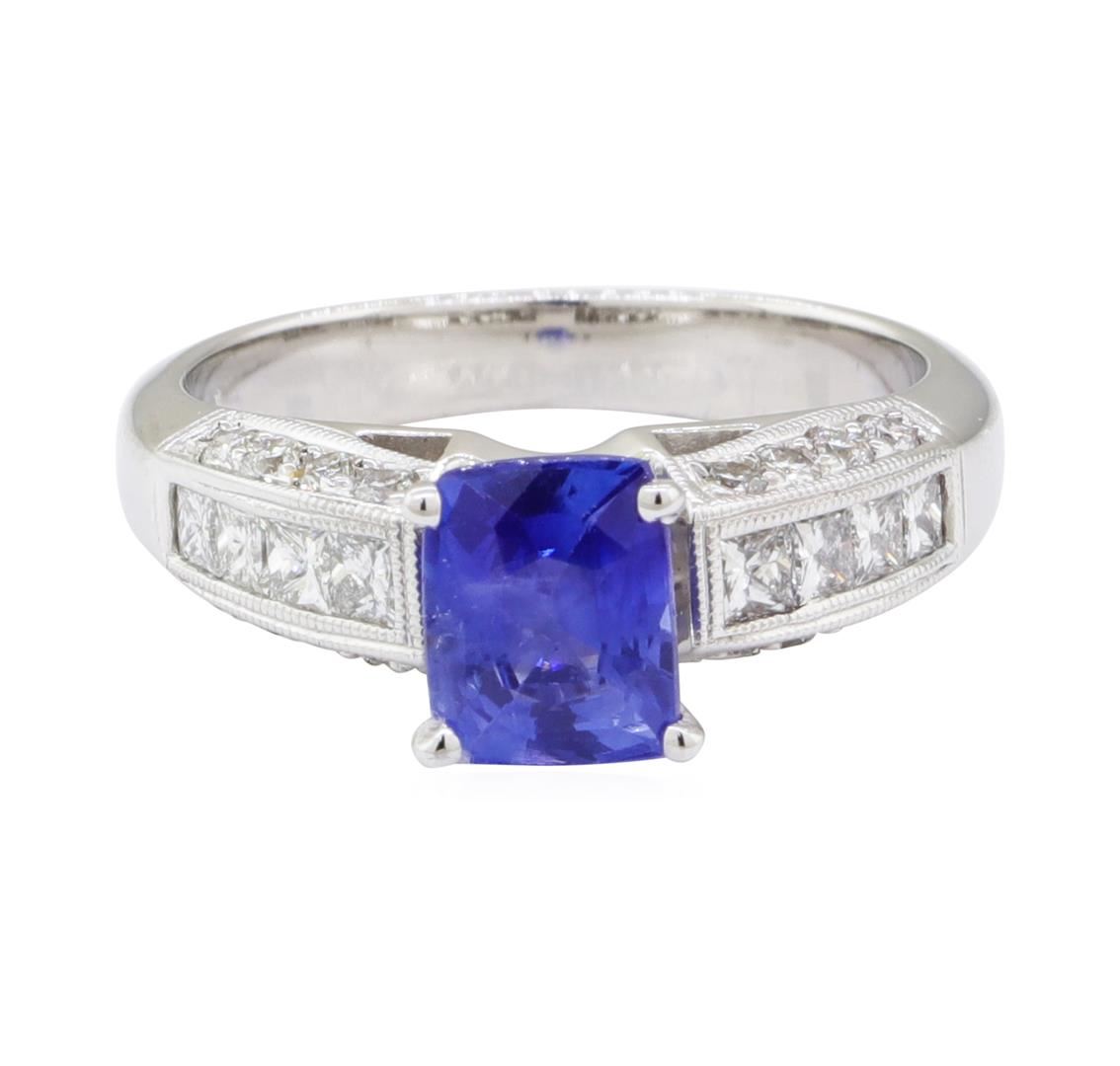One electronically tested 18KT white gold lady's combination cast & assembled fashion ring with a tapered cathedral shank with a bright polish with milgrain detailing finish. The featured lady's ring has a shank measuring 3.00 millimeters wide. Identified with markings of 'K18'. Condition is new, good workmanship. Containing: One prong set rectangular cushion modified mixed cut natural blue sapphire, measuring 7.04 x 5.61 x 3.90mm, (depth est.) approximate weight of 1.48ct., clarity is slightly included, medium, moderately strong, violetish blue color, (GIA vB 5/4), cut is very good. Transmitting light with a minimum of distortion, transparent. Colored gemstones are presumed to have been subjected to commonly used enhancement processes. Graded in the setting. Eight channel set princess cut diamonds, measuring 2.30 x 2.00 x 1.50mm (depth est.) approximate total weight of 8 Stones = 0.45ct. Graded in the setting. Color G - H Clarity VS-2 to SI-1 Cut Very Good Sixteen prong set round brilliant cut diamonds, measuring 1.50 - 1.45 x 0.92mm (depth est.) approximate total weight of 16 Stones = 0.20ct. Graded in the setting. Color G - H Clarity VS-2 to SI-1 Cut Very Good. Total Weight of Colored Stones 1.48ct.. Total Weight of Diamonds 0.65ct.. Total Weight of Ring 5.30gm GAS Appraised at $4935.00. GAS Appraised at $4,140.00.
