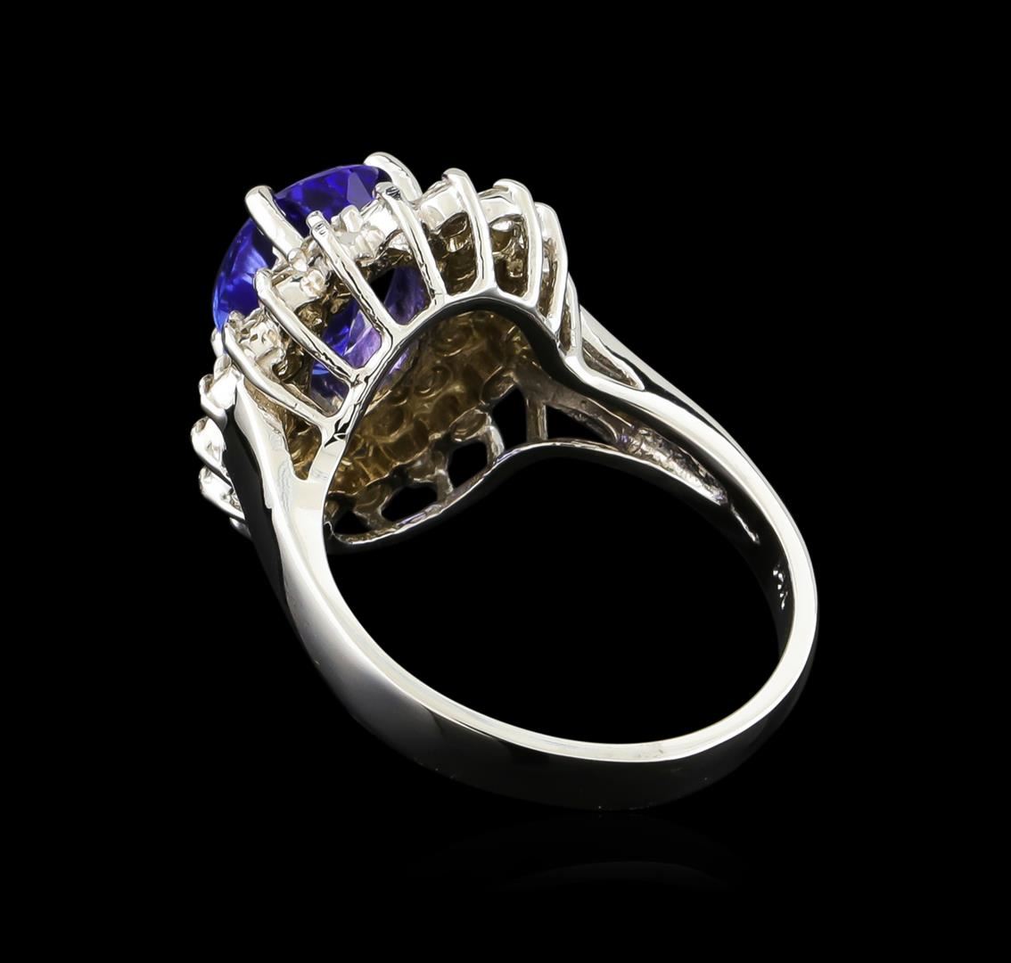 One electronically tested 14KT white gold lady's cast fashion ring with a double basket halo with a bright polish finish. The featured lady's ring has a shank measuring 2.80 millimeters wide. Identified with markings of "14K". Condition is new, good workmanship. Containing: One prong set oval modified brilliant cut natural tanzanite, measuring 9.27 x 6.93 x 4.80mm, approximate weight of 2.13ct., clarity is eye clean, type I, medium dark, very slightly grayish, violetish blue color, (GIA vB 6/3), cut is good. Transmitting light with no distortion, transparent. Colored gemstones are presumed to have been subjected to commonly used enhancement processes. Graded in the setting. Thirty-Two prong set round brilliant cut diamonds, measuring 1.90 - 1.80 x 1.13mm (depth est.) approximate total weight of 32 Stones = 0.75ct. Graded in the setting. Clarity: VS-2 to SI-2. Color: G - I. Cut Good. Total Weight of Colored Stones 2.13ct. Total Weight of Diamonds 0.75ct. Total Weight of Ring 5.60gm.