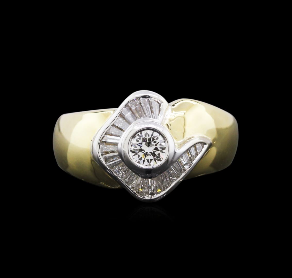 One ring featuring: 18KT yellow and white gold weighing 5.00 grams containing one diamond center stone with a total weight of 0.30ct and 22 tapered baguette cut diamonds with a total weight of 1.83ct.