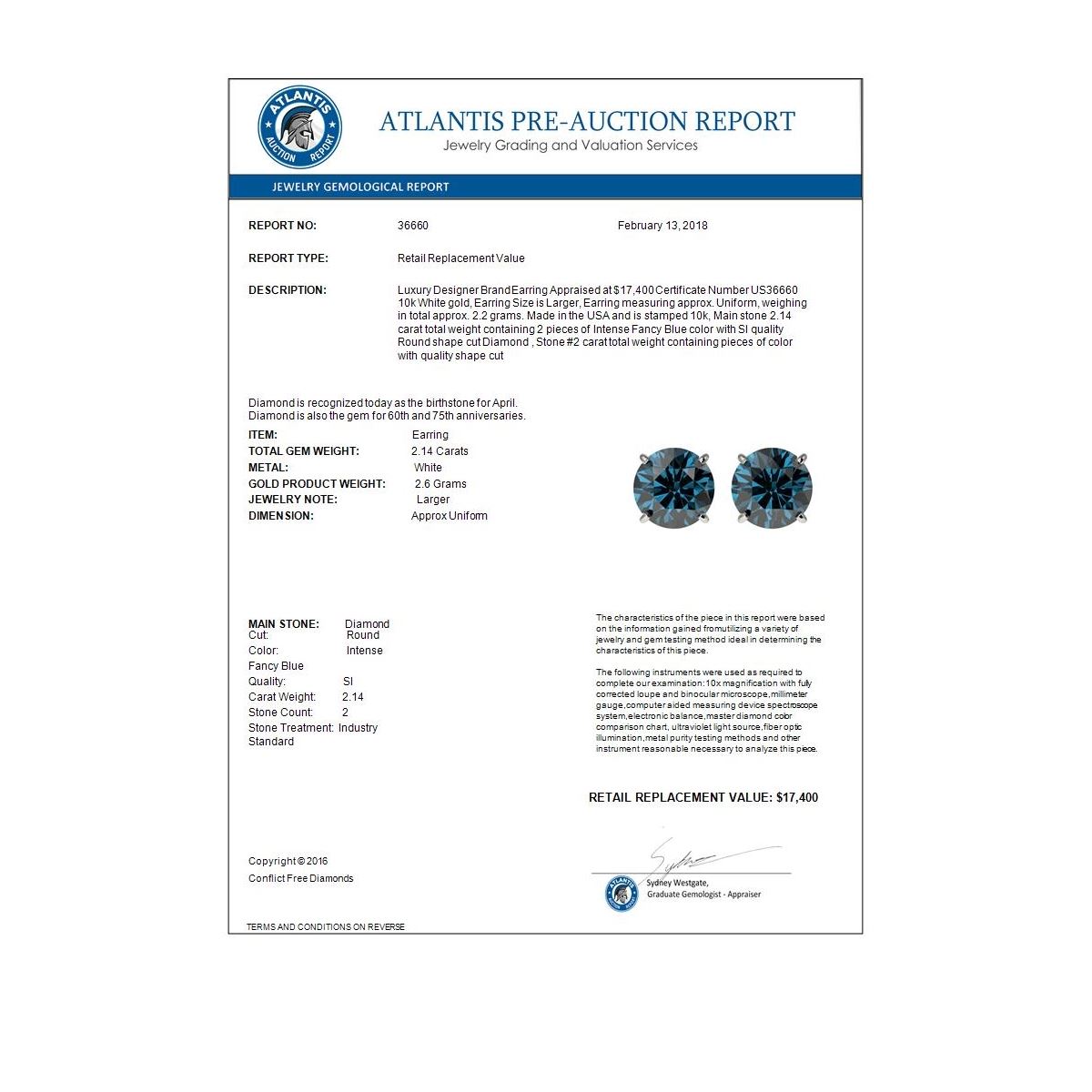 REF-217X5T -36660 ---- 2.14 CTW Certified Intense Blue SI Diamond Solitaire Stud Earrings 10K White Gold ---- Luxury Designer Brand Earring Appraised at $17,400 Certificate Number US36660 10k White gold, Earring Size is Larger, Earring measuring approx. Uniform, weighing in total approx. 2.2 grams. Made in the USA and is stamped 10k, Main stone 2.14 carat total weight containing 2 pieces of Intense Fancy Blue color with SI quality Round shape cut Diamond , Stone #2 carat total weight containing pieces of color with quality shape cut