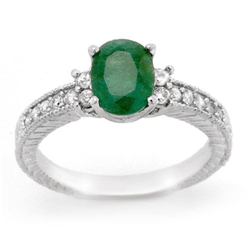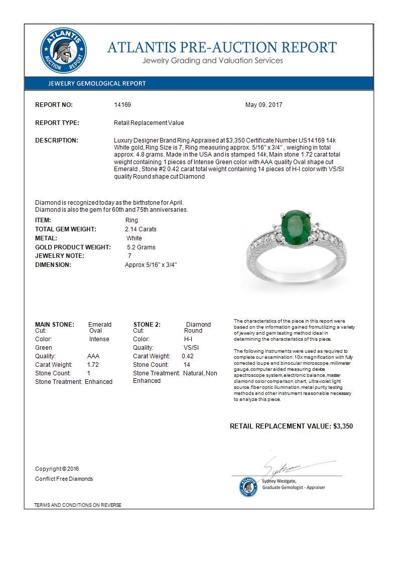 2.14 CTW Emerald & Diamond Ring 14K White Gold ---- Luxury Designer Brand Ring Appraised Retail Price at $3,350 ---- SKU Number US14169 14k White gold Ring Size is 7, Ring measuring approx. 5/16" x 3/4" , weighing in total approx. 4.8 grams. Made in the USA and is stamped 14k, Main stone 1.72 carat total weight containing 1 pieces of Intense Green color with AAA quality Oval shape cut Emerald , Stone #2 0.42 carat total weight containing 14 pieces of H-I color with VS/SI quality Round shape cut