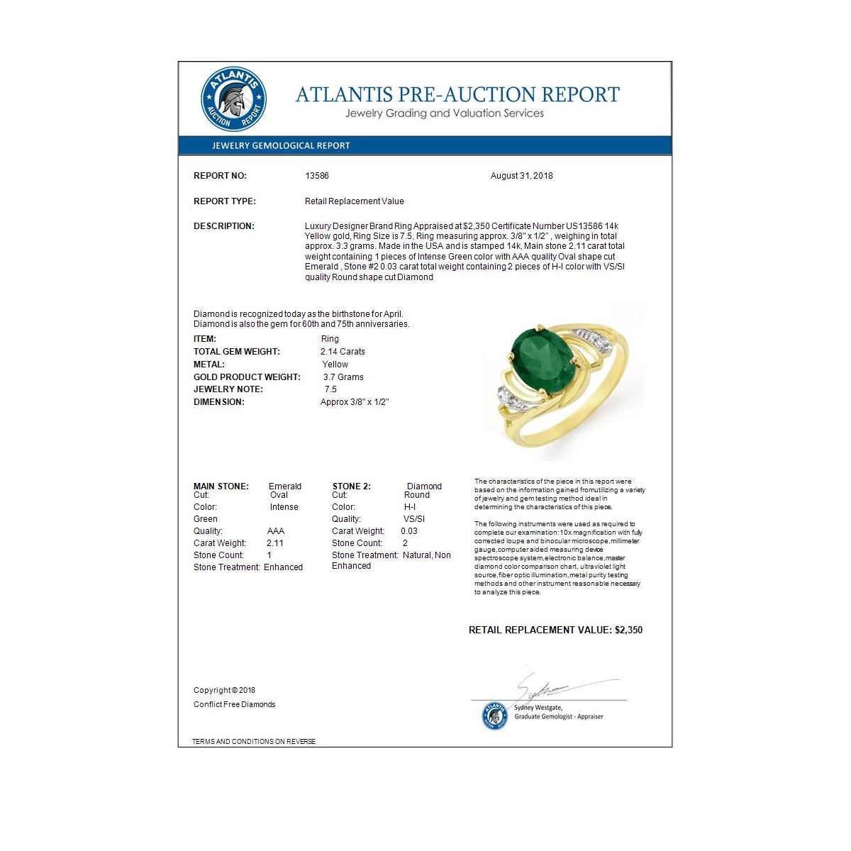 REF-35A3X -13586 ---- 2.14 CTW Emerald & Diamond Ring 14K Yellow Gold ---- Luxury Designer Brand Ring Appraised at $2,350 Certificate Number US13586 14k Yellow gold, Ring Size is 7.5, Ring measuring approx. 3/8" x 1/2" , weighing in total approx. 3.3 grams. Made in the USA and is stamped 14k, Main stone 2.11 carat total weight containing 1 pieces of Intense Green color with AAA quality Oval shape cut Emerald , Stone #2 0.03 carat total weight containing 2 pieces of H-I color with VS/SI quality Round shape cut Diamond