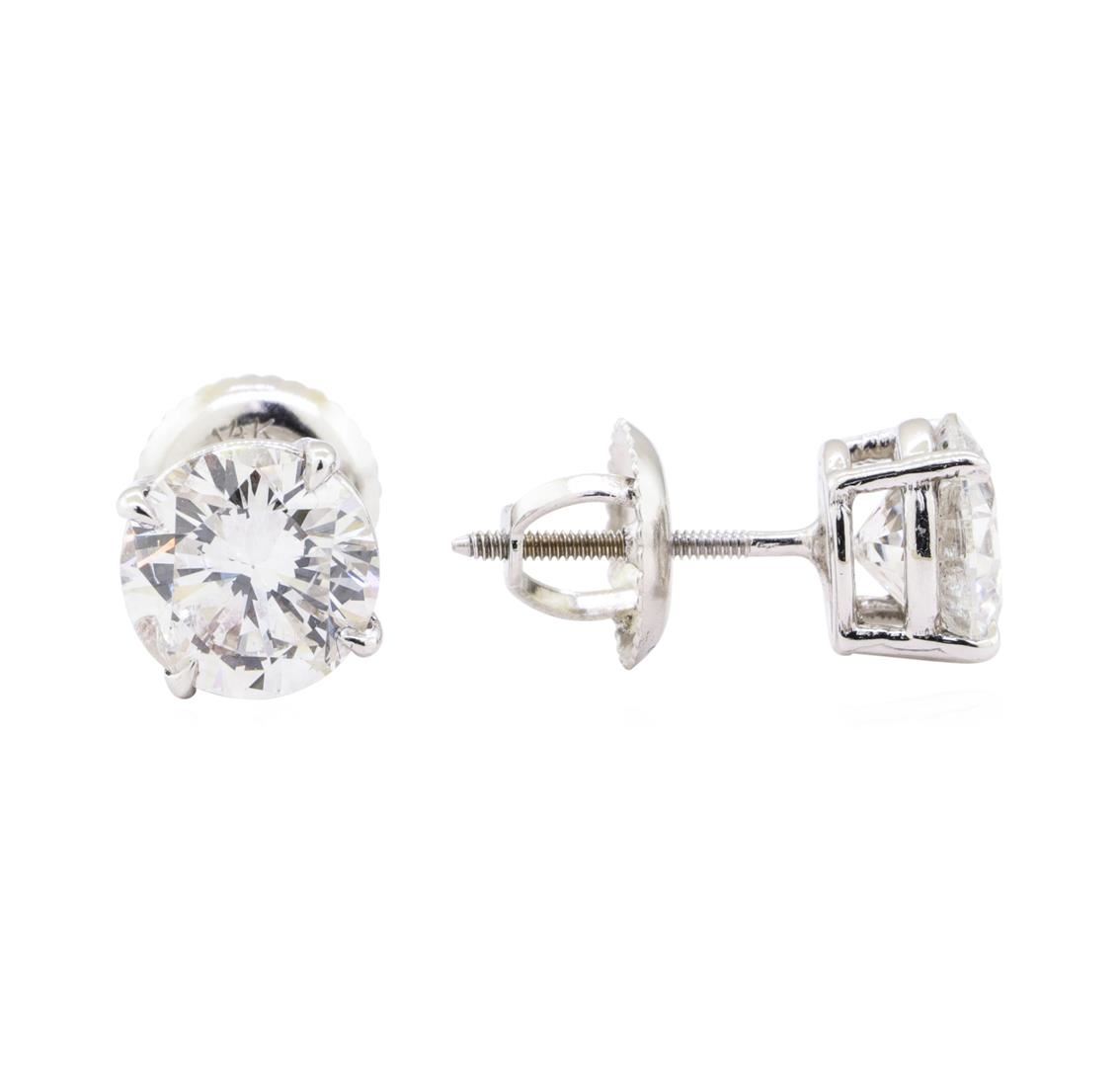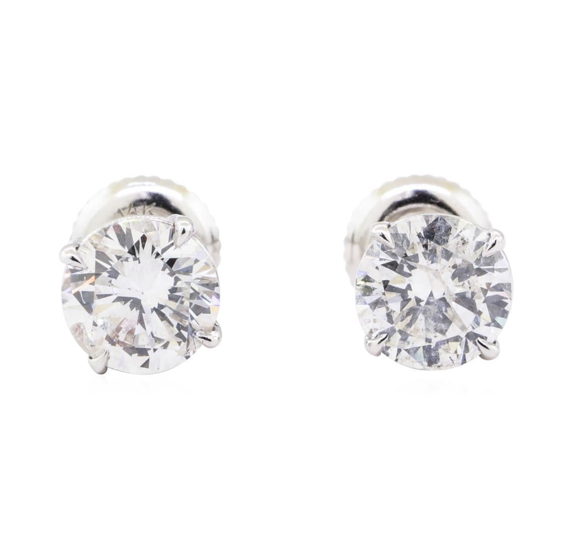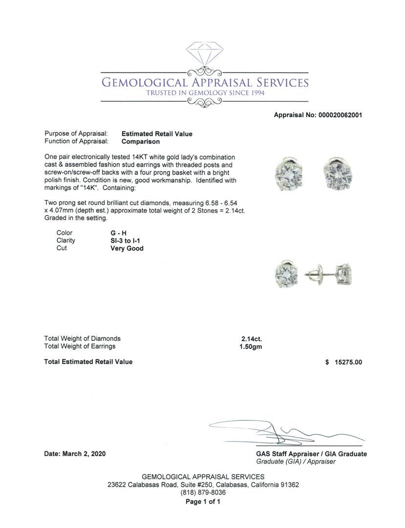 One pair electronically tested 14KT white gold lady's combination cast & assembled fashion stud earrings with threaded posts and screw-on/screw-off backs with a four prong basket with a bright polish finish. Identified with markings of '14K'. Condition is new, good workmanship. Containing: Two prong set round brilliant cut diamonds, measuring 6.58 - 6.54 x 4.07mm (depth est.) approximate total weight of 2 Stones = 2.14ct. Graded in the setting. Color G - H Clarity SI-3 to I-1 Cut Very Good. Total Weight of Diamonds 2.14ct.. Total Weight of Earrings 1.50gm GAS Appraised at $15275.00. GAS Appraised at $15,275.00.