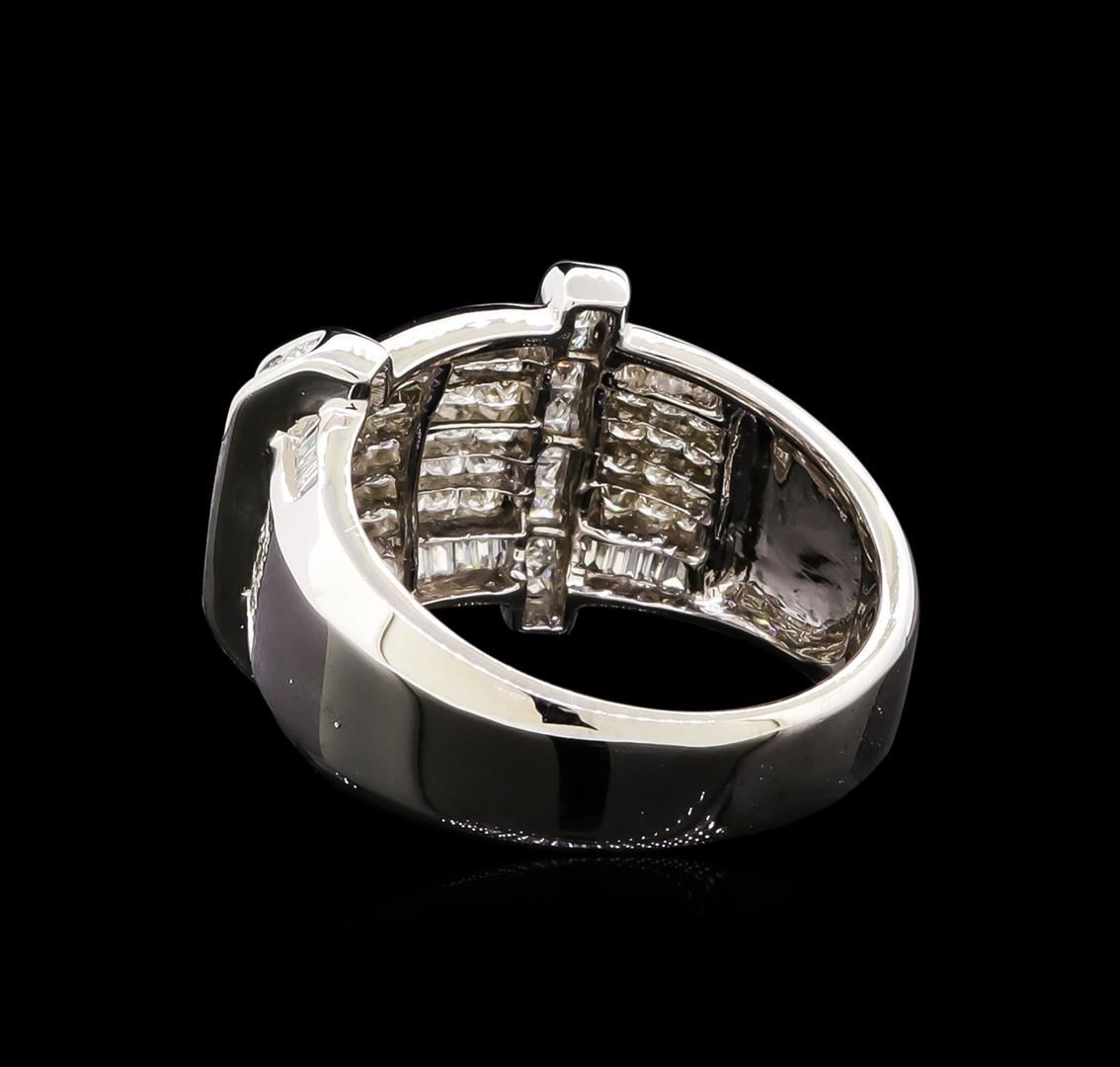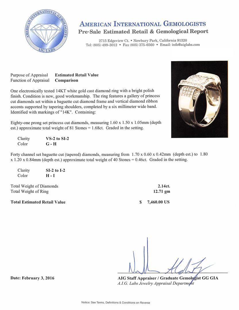One electronically tested 14KT white gold cast diamond ring with a bright polish finish. The ring features a gallery of princess cut diamonds set within a baguette cut diamond frame and vertical diamond ribbon accents supported by tapering shoulders, completed by a six millimeter wide band. Identified with markings of "14K". Condition is new, good workmanship. Containing: Eighty-One prong set princess cut diamonds, measuring 1.60 x 1.50 x 1.05mm (depth est.) approximate total weight of 81 Stones = 1.68ct. Graded in the setting. Clarity: VS-2 to SI-2. Color: G - H Forty channel set baguette cut (tapered) diamonds, measuring from 1.70 x 0.60 x 0.42mm (depth est.) to 1.80 x 1.20 x 0.84mm (depth est.) approximate total weight of 40 Stones = 0.46ct. Graded in the setting. Clarity: SI-2 to I-2. Color: H - I. Total Weight of Diamonds 2.14ct. Total Weight of Ring 12.71gm. AIG Appraised at $7,460.00.