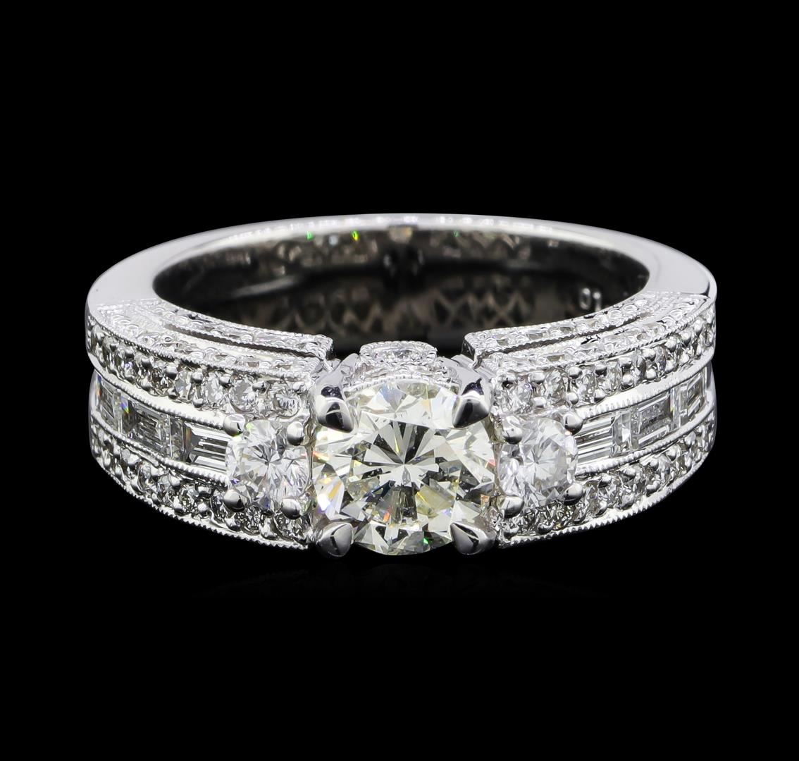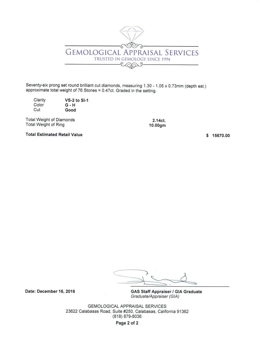 One electronically tested 18KT white gold lady's cast wedding ring with a split cathedral shank with a bright polish with milgrain detailing finish. The featured lady's ring has a shank measuring 4.83 millimeters wide. Identified with markings of 'K18'. Condition is new, good workmanship. Containing: One prong set round brilliant cut diamond, measuring 6.13 - 6.11 x 3.98mm (depth est.) , 5.00.%. GTCF approximate weight of 1.00ct. Graded in the setting. Clarity VS-2. Color: J Cut Good Two prong set round brilliant cut diamonds, measuring 3.10 - 3.05 x 1.91mm (depth est.) approximate total weight of 2 Stones = 0.22ct. Graded in the setting. Clarity SI-1 to SI-2. Color: G - H Cut Good Two bezel set round brilliant cut diamonds, measuring 1.90 - 1.85 x 1.17mm (depth est.) approximate total weight of 2 Stones = 0.05ct. Graded in the setting. Clarity SI-1 to SI-2. Color: G - H Cut Good Six channel set baguette cut diamonds, measuring from 3.40 x 1.50 x 1.28mm (depth est.) to 3.60 x 1.60 x 1.36mm (depth est.) approximate total weight of 6 Stones = 0.40ct. Graded in the setting. Clarity VS-1 to VS-2. Color: G - H Cut Very Good Seventy-Six prong set round brilliant cut diamonds, measuring 1.30 - 1.05 x 0.73mm (depth est.) approximate total weight of 76 Stones = 0.47ct. Graded in the setting. Clarity VS-2 to SI-1. Color: G - H Cut Good. Total Weight of Diamonds 2.14ct.. Total Weight of Ring 10.00gm. GAS Appraised at $15,670.00.