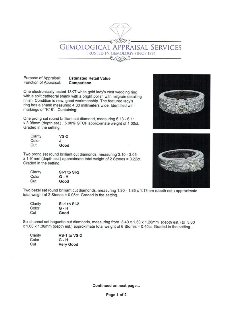 One electronically tested 18KT white gold lady's cast wedding ring with a split cathedral shank with a bright polish with milgrain detailing finish. The featured lady's ring has a shank measuring 4.83 millimeters wide. Identified with markings of 'K18'. Condition is new, good workmanship. Containing: One prong set round brilliant cut diamond, measuring 6.13 - 6.11 x 3.98mm (depth est.) , 5.00.%. GTCF approximate weight of 1.00ct. Graded in the setting. Clarity VS-2. Color: J Cut Good Two prong set round brilliant cut diamonds, measuring 3.10 - 3.05 x 1.91mm (depth est.) approximate total weight of 2 Stones = 0.22ct. Graded in the setting. Clarity SI-1 to SI-2. Color: G - H Cut Good Two bezel set round brilliant cut diamonds, measuring 1.90 - 1.85 x 1.17mm (depth est.) approximate total weight of 2 Stones = 0.05ct. Graded in the setting. Clarity SI-1 to SI-2. Color: G - H Cut Good Six channel set baguette cut diamonds, measuring from 3.40 x 1.50 x 1.28mm (depth est.) to 3.60 x 1.60 x 1.36mm (depth est.) approximate total weight of 6 Stones = 0.40ct. Graded in the setting. Clarity VS-1 to VS-2. Color: G - H Cut Very Good Seventy-Six prong set round brilliant cut diamonds, measuring 1.30 - 1.05 x 0.73mm (depth est.) approximate total weight of 76 Stones = 0.47ct. Graded in the setting. Clarity VS-2 to SI-1. Color: G - H Cut Good. Total Weight of Diamonds 2.14ct.. Total Weight of Ring 10.00gm. GAS Appraised at $15,670.00.