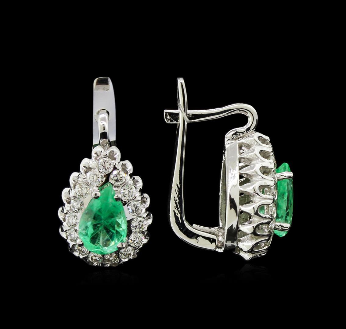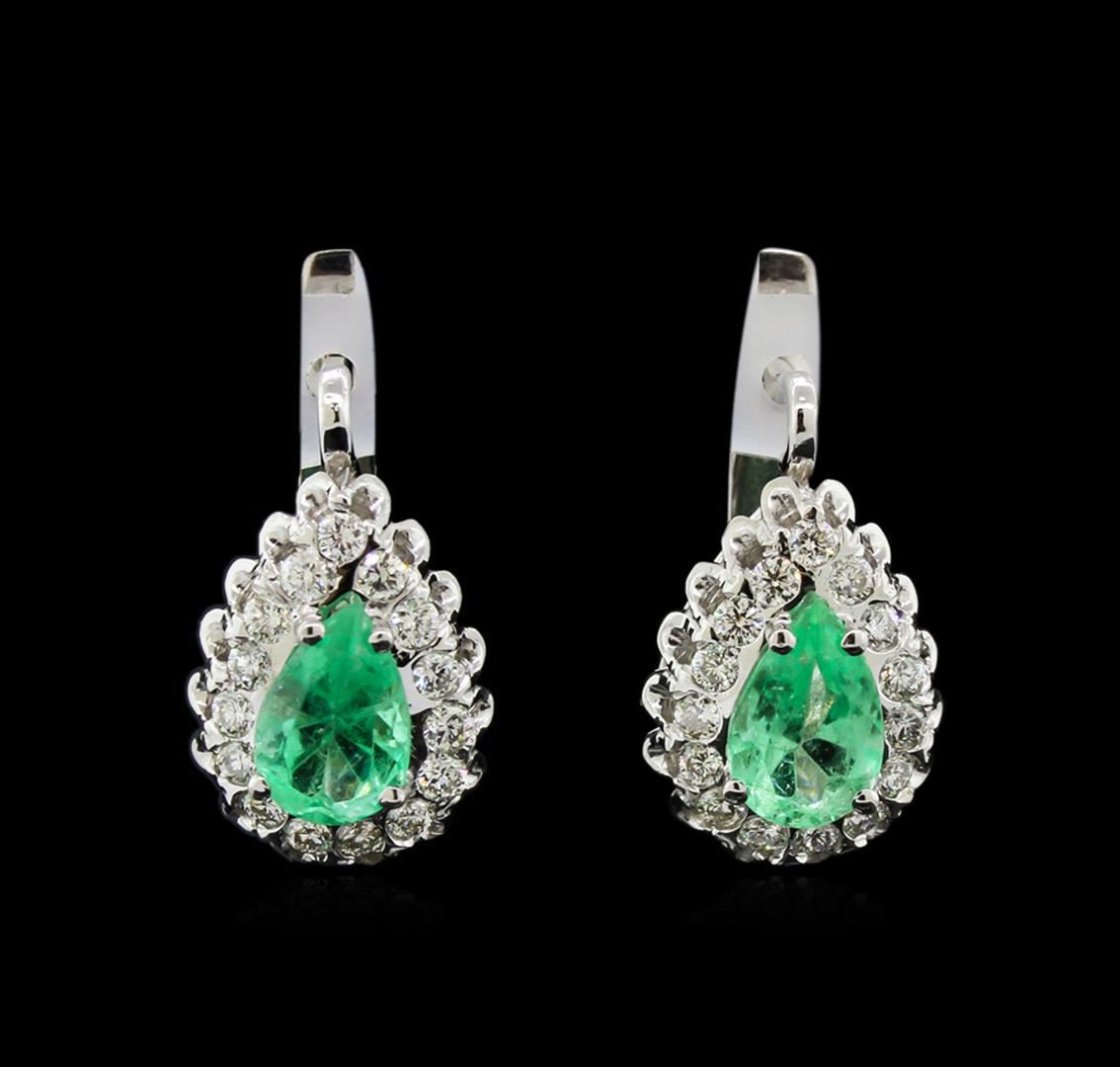 One pair electronically tested 14KT white gold lady's combination cast & assembled fashion earrings with hinged clip backs with a bright polish finish. The featured lady's earrings have a teardrop halo motif. Identified with markings of "14K". Condition is new, good workmanship. Containing: Two prong set pear modified brilliant cut natural emeralds, measuring 8.61 x 5.60 x 4.10mm, approximate total weight of 2.14ct., clarity is moderately included, type III, medium light, moderately strong, green color, (GIA G 4/4), cut is good. Transmitting light somewhat diffusely, transparent to translucent. Indications of oil residue. Naturally occurring internal & external characteristics are present. Graded in the setting. Thirty prong set round brilliant cut diamonds, measuring 1.90 - 1.80 x 1.17mm (depth est.) approximate total weight of 30 Stones = 0.75ct. Graded in the setting. Clarity: VS-2 to SI-1. Color: H - I. Cut Good. Total Weight of Colored Stones 2.14ct. Total Weight of Diamonds 0.75ct. Total Weight of Earrings 7.60gm. GAS Appraised at $6,380.00.