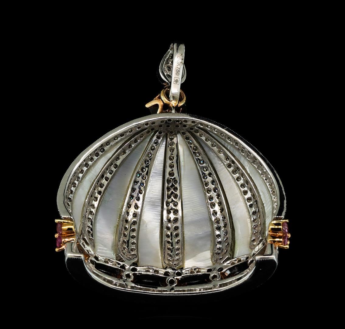 One electronically tested 18KT white gold ladies cast & assembled multi gemstone and diamond pendant. The pendant features a convex crown of alternating diamond and mother of pearl stripes with a pink sapphire and diamond ribbon trim, completed by a pyrope-almandite garnet and diamond set bail. Bright polish finish with milgrain detailing and rose gold overlay accents. Mother-of-pearl, also referred to as nacre, is an organic-inorganic composite material produced by some mollusks as an inner shell layer. It is strong, resilient, and iridescent. The main commercial sources of mother-of-pearl are the pearl oyster, freshwater pearl mussels, and sometimes the abalone. In the 1900's mother-of-pearl was commonly used to make pearl buttons. Today, mother-of-pearl is used in a wide variety of jewelry. Identified with markings of '18K 750'. Condition is good. Containing: One prong set round mixed cut natural pyrope-almandite garnet, measuring 6.05 - 6.00 x 3.92 mm, approximate weight of 1.09ct., clarity is eye clean, dark, very slightly brownish, orangy red color, (GIA oR 7/3), cut is good. Transmitting light with no distortion, transparent. Refractive index testing results of 1.76. This is a conclusive result for pyrope-almandite garnet. Graded in the setting. Twenty-one prong set round mixed cut natural pink sapphires, measuring 2.20 - 2.10 x 1.40 mm, approximate total weight of 1.05ct., clarity is eye clean, medium, very slightly grayish, pink color, (GIA Pk 5/3), cut is good. Transmitting light with no distortion, transparent. Measurements & the color grade are an average for the group. Graded in the setting. Two Hundred Ninety-Six prong & channel set round brilliant & baguette cut diamonds approximate total weight of 296 Stones = 2.07ct. Graded in the setting. Clarity VS-2 to SI-2. Color: F - H. Total Weight of Colored Stones 2.14ct.. Total Weight of Diamonds 2.07ct.. Total Weight of Pendant 14.19gm. AIG Appraised at $13,035.00.