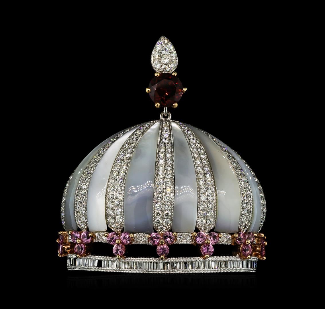 One electronically tested 18KT white gold ladies cast & assembled multi gemstone and diamond pendant. The pendant features a convex crown of alternating diamond and mother of pearl stripes with a pink sapphire and diamond ribbon trim, completed by a pyrope-almandite garnet and diamond set bail. Bright polish finish with milgrain detailing and rose gold overlay accents. Mother-of-pearl, also referred to as nacre, is an organic-inorganic composite material produced by some mollusks as an inner shell layer. It is strong, resilient, and iridescent. The main commercial sources of mother-of-pearl are the pearl oyster, freshwater pearl mussels, and sometimes the abalone. In the 1900's mother-of-pearl was commonly used to make pearl buttons. Today, mother-of-pearl is used in a wide variety of jewelry. Identified with markings of '18K 750'. Condition is good. Containing: One prong set round mixed cut natural pyrope-almandite garnet, measuring 6.05 - 6.00 x 3.92 mm, approximate weight of 1.09ct., clarity is eye clean, dark, very slightly brownish, orangy red color, (GIA oR 7/3), cut is good. Transmitting light with no distortion, transparent. Refractive index testing results of 1.76. This is a conclusive result for pyrope-almandite garnet. Graded in the setting. Twenty-one prong set round mixed cut natural pink sapphires, measuring 2.20 - 2.10 x 1.40 mm, approximate total weight of 1.05ct., clarity is eye clean, medium, very slightly grayish, pink color, (GIA Pk 5/3), cut is good. Transmitting light with no distortion, transparent. Measurements & the color grade are an average for the group. Graded in the setting. Two Hundred Ninety-Six prong & channel set round brilliant & baguette cut diamonds approximate total weight of 296 Stones = 2.07ct. Graded in the setting. Clarity VS-2 to SI-2. Color: F - H. Total Weight of Colored Stones 2.14ct.. Total Weight of Diamonds 2.07ct.. Total Weight of Pendant 14.19gm. AIG Appraised at $13,035.00.