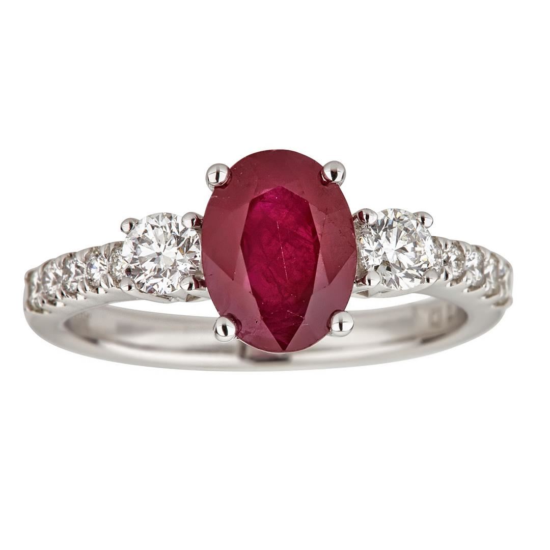One Ruby and Diamond Ring featuring: 18KT White Gold with a total weight of 3.78 grams, Ruby with a total weight of 2.14ctw, Two Round Cut Diamond with a total weight of 0.40ctw, and Ten Round Cut Diamonds with a total weight of 0.19ctw.