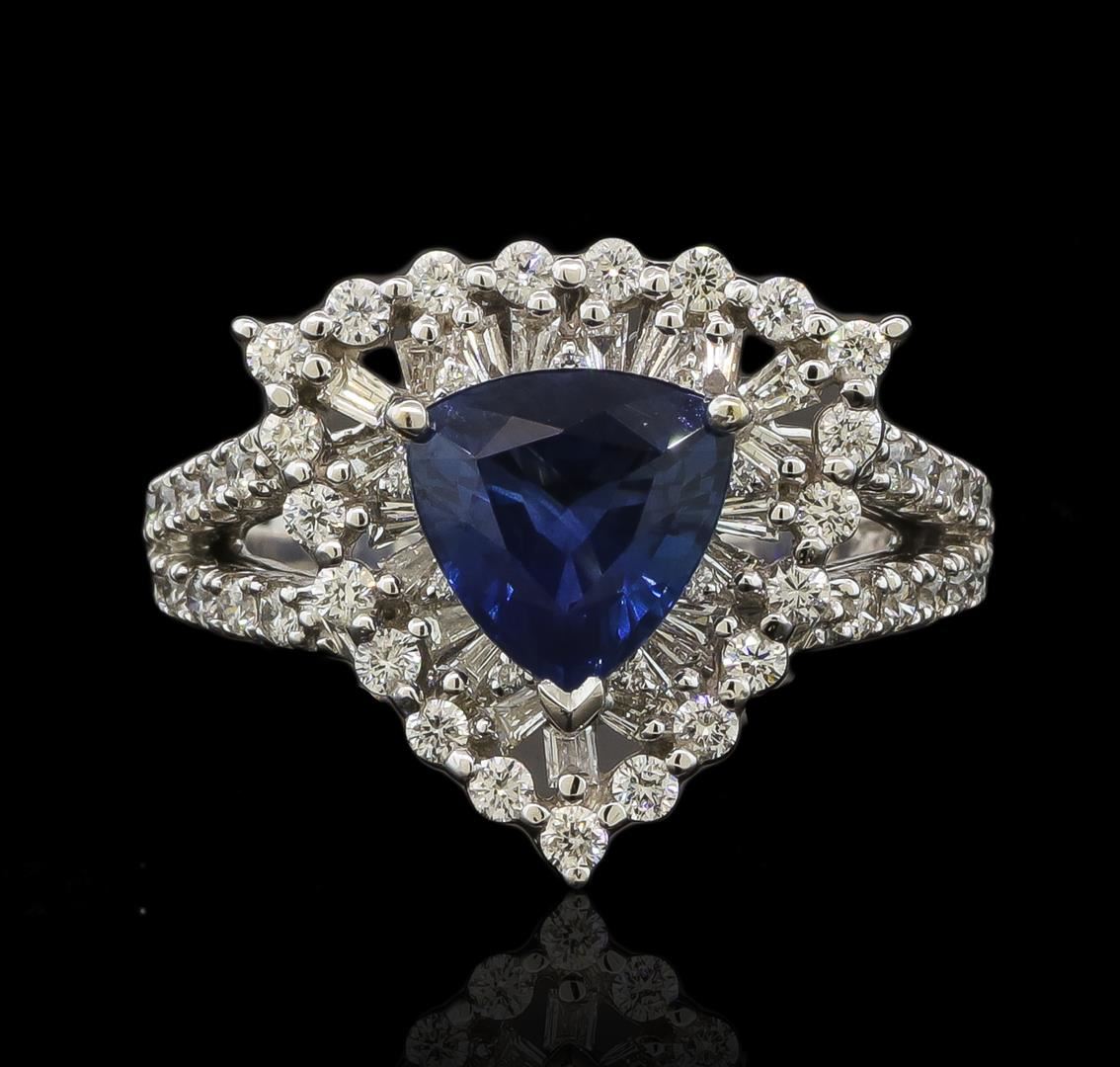 One electronically tested 14KT white gold lady's cast fashion ring with a split shank basket halo with a bright polish finish. The featured lady's ring has a shank measuring 2.44 millimeters wide. Identified with markings of '14K'. Condition is new, good workmanship. Containing: One prong set triangle modified brilliant cut natural blue sapphire, measuring 8.20 x 8.30 x 4.33mm, (depth est.) approximate weight of 2.14ct., clarity is eye clean, medium, very slightly grayish, blue color, (GIA B 5/3), cut is good. Transmitting light with no distortion, transparent. Colored gemstones are presumed to have been subjected to commonly used enhancement processes. Graded in the setting. Twenty-One prong set baguette cut (tapered) diamonds, measuring from 1.85 x 1.10 x 0.94mm (depth est.) to 1.90 x 1.70 x 1.45mm (depth est.) approximate total weight of 21 Stones = 0.65ct. Graded in the setting. Clarity VS-2 to SI-1. Color: H - I Cut Very Good Forty-One prong set round brilliant cut diamonds, measuring 1.70 - 1.50 x 0.99mm (depth est.) approximate total weight of 41 Stones = 0.63ct. Graded in the setting. Clarity SI-1 to SI-2. Color: H - I Cut Good Nine prong set round brilliant cut diamonds, measuring 1.00 - 0.90 x 0.59mm (depth est.) approximate total weight of 9 Stones = 0.03ct. Graded in the setting. Clarity VS-2 to SI-2. Color: G - H Cut Good. Total Weight of Colored Stones 2.14ct.. Total Weight of Diamonds 1.31ct.. Total Weight of Ring 5.60gm. GAS Appraised at $10,445.00.