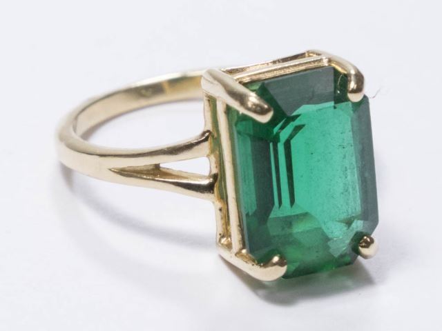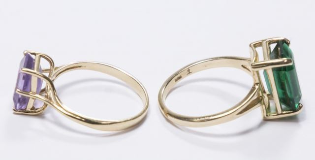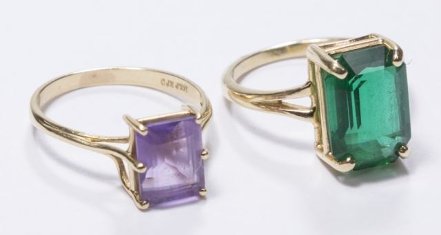 One with emerald obsidianite (with original receipt), approx. size 9; and one with possibly alexandrite, approx. size 9. Total weight approx. 4.9 dwt. (6037)