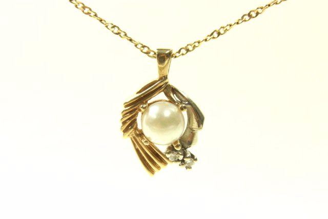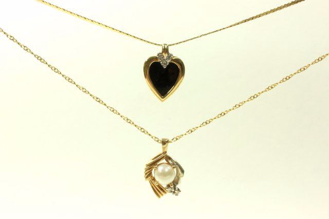 1 with onyx heart and diamond chip; 1 with pearl and diamond chips. Approx. 6.8 dwt.