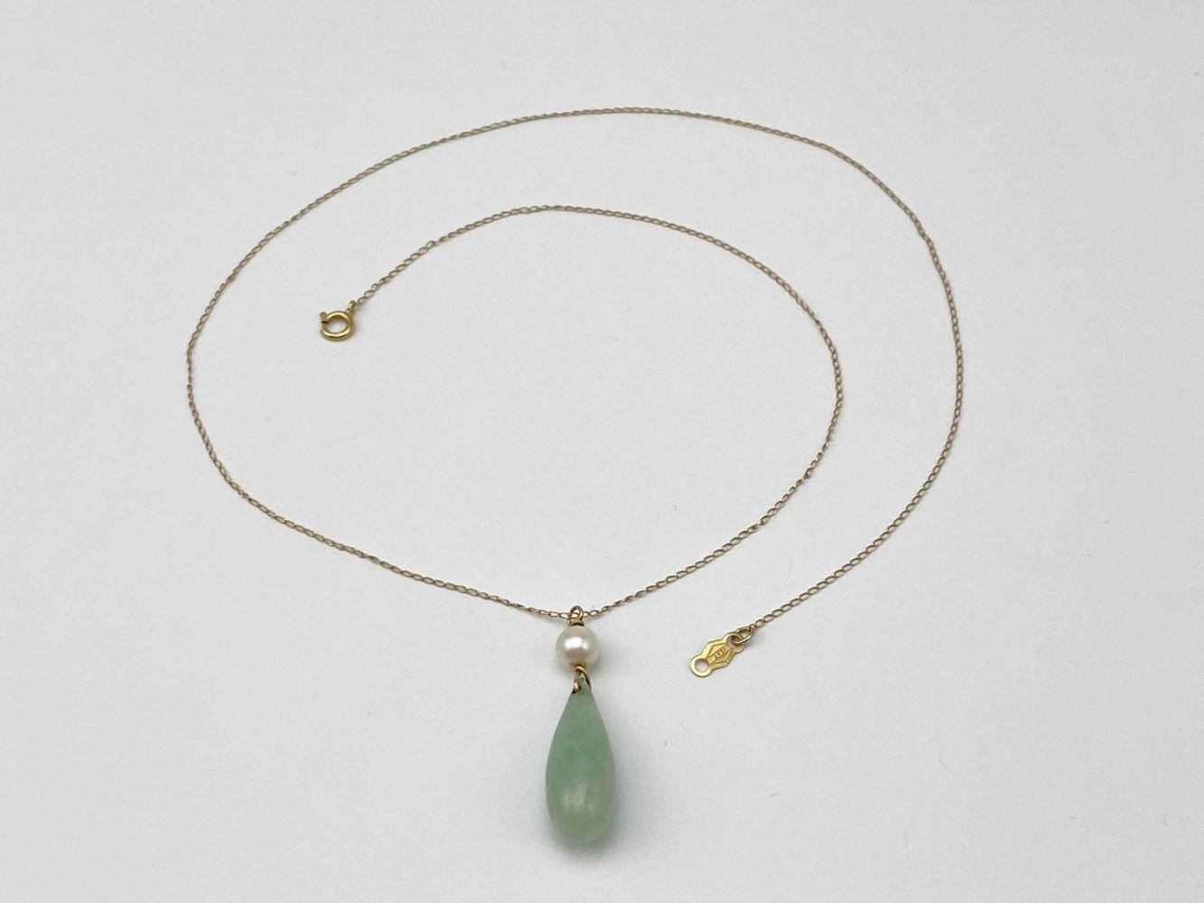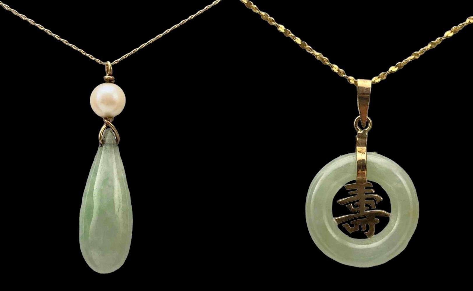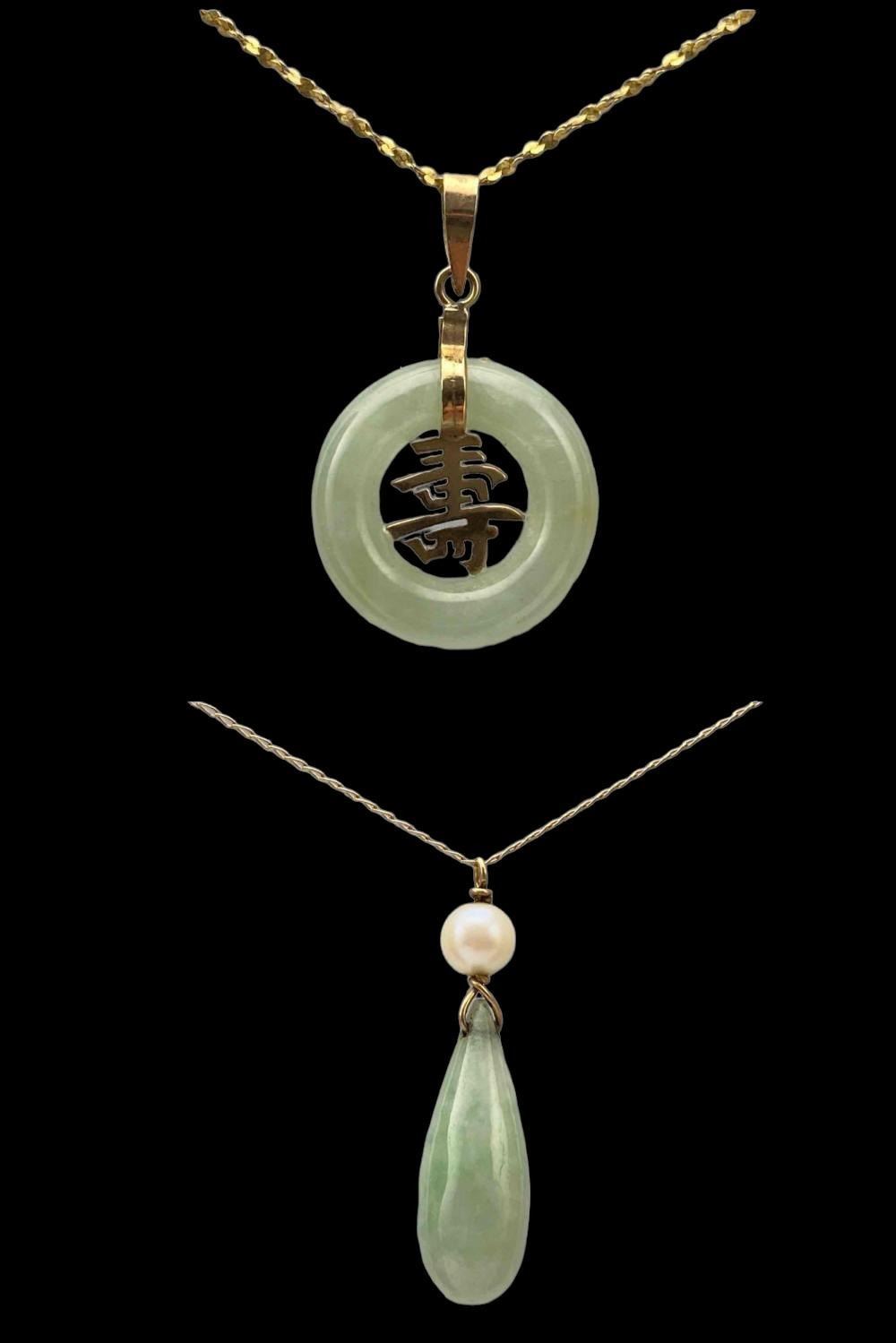 14K Jade Necklaces with Pearl And Chinese Good Fortune Symbol, 4.8g. Marked 14K. Chains Approximately 18.0L And 17.0L in. Pendants Approximately 1.25L x 0.25Win And 0.625L x 0.625W in. ALL CREDIT CARDS WILL BE MANUALLY VERIFIED PRIOR TO SHIPMENT.