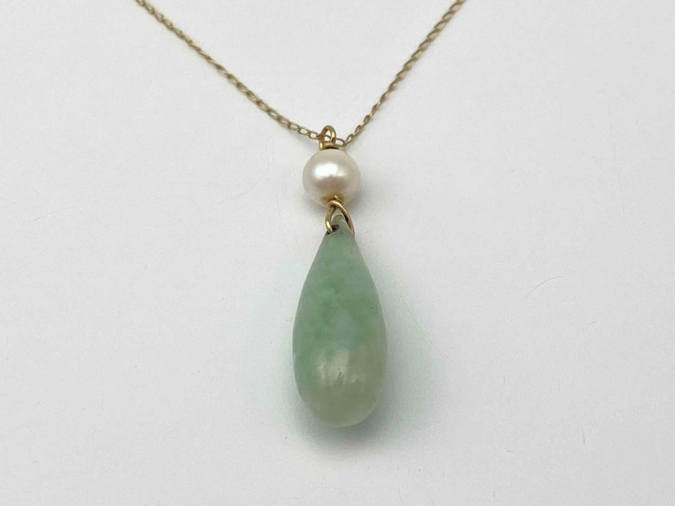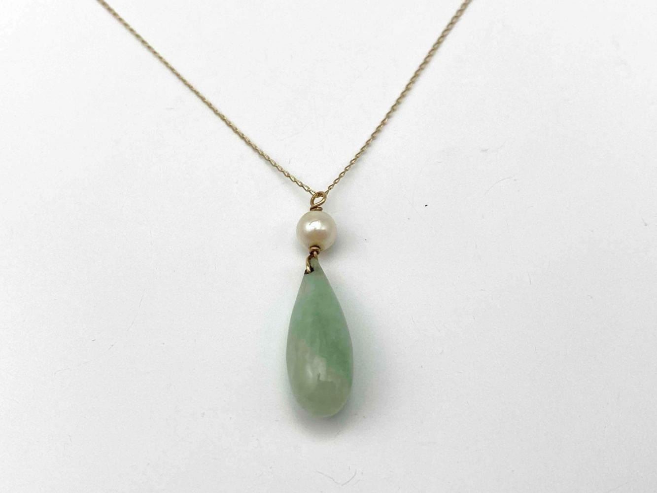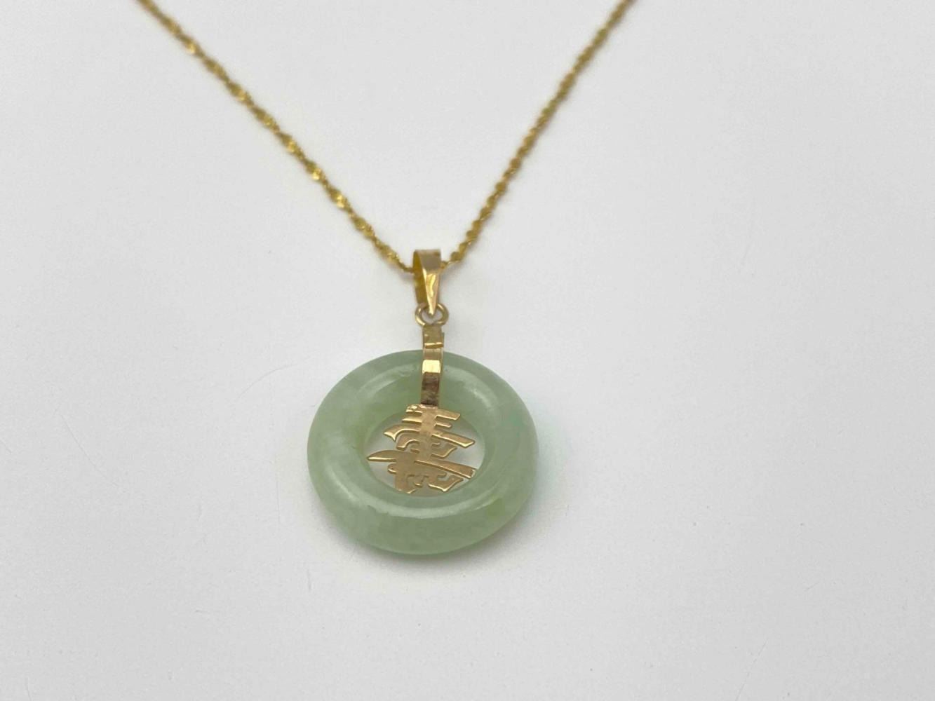 14K Jade Necklaces with Pearl And Chinese Good Fortune Symbol, 4.8g. Marked 14K. Chains Approximately 18.0L And 17.0L in. Pendants Approximately 1.25L x 0.25Win And 0.625L x 0.625W in. ALL CREDIT CARDS WILL BE MANUALLY VERIFIED PRIOR TO SHIPMENT.