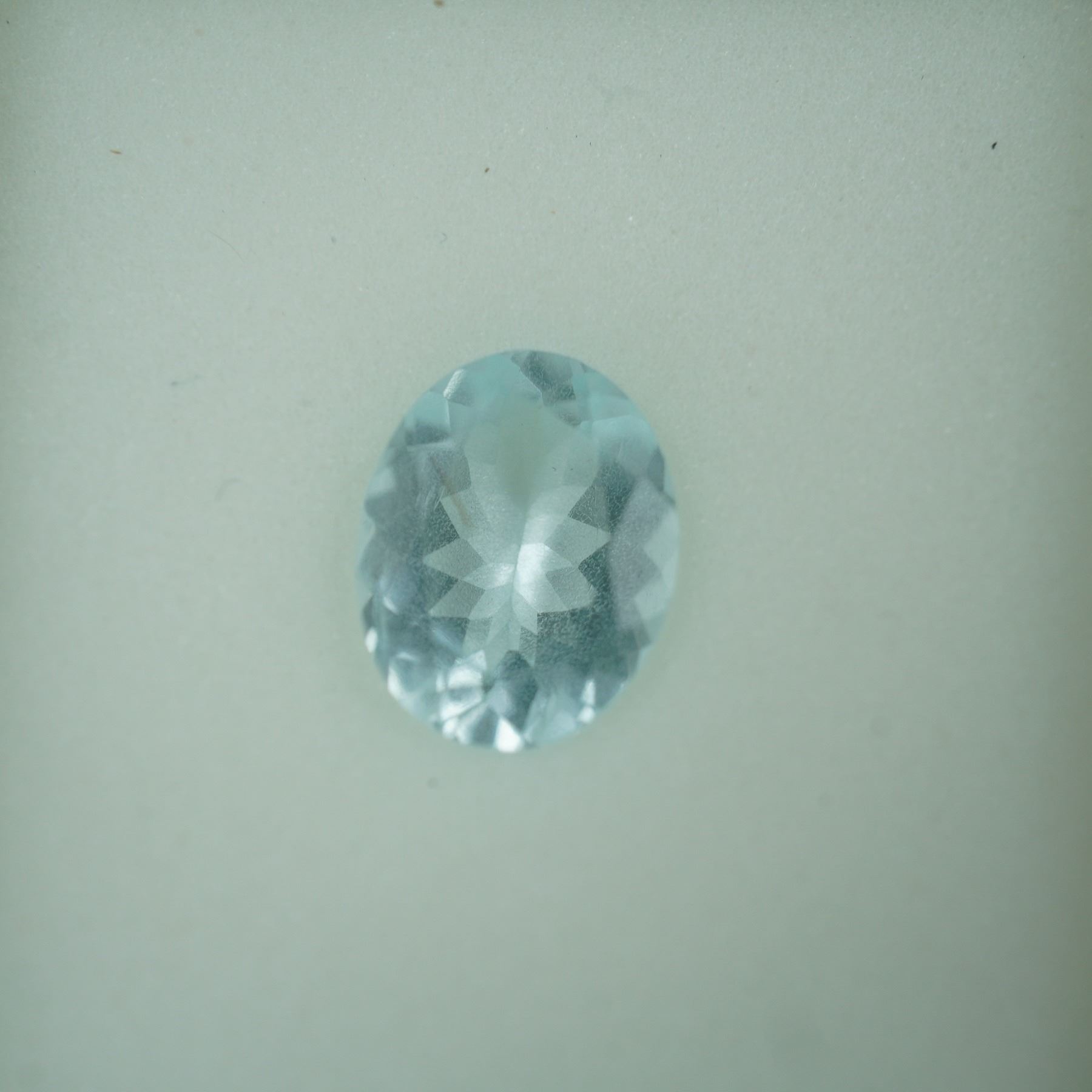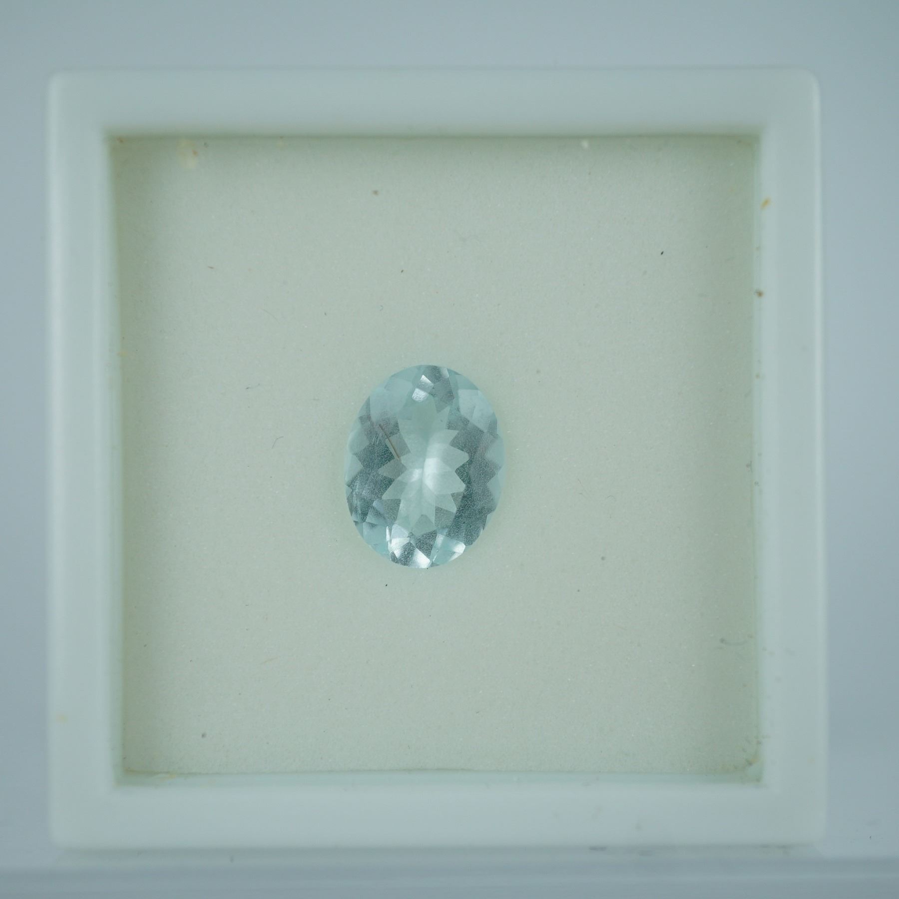 Brilliant natural aquamarine gemstone weighing approximately 2.15 carats, presented in a classic oval cut. This pale blue stone displays the soft, icy hue characteristic of aquamarine and features multiple facets that reflect light with subtle shimmer. Aquamarine is part of the beryl family and is favored for its serene color and clarity. Comes with a protective case.