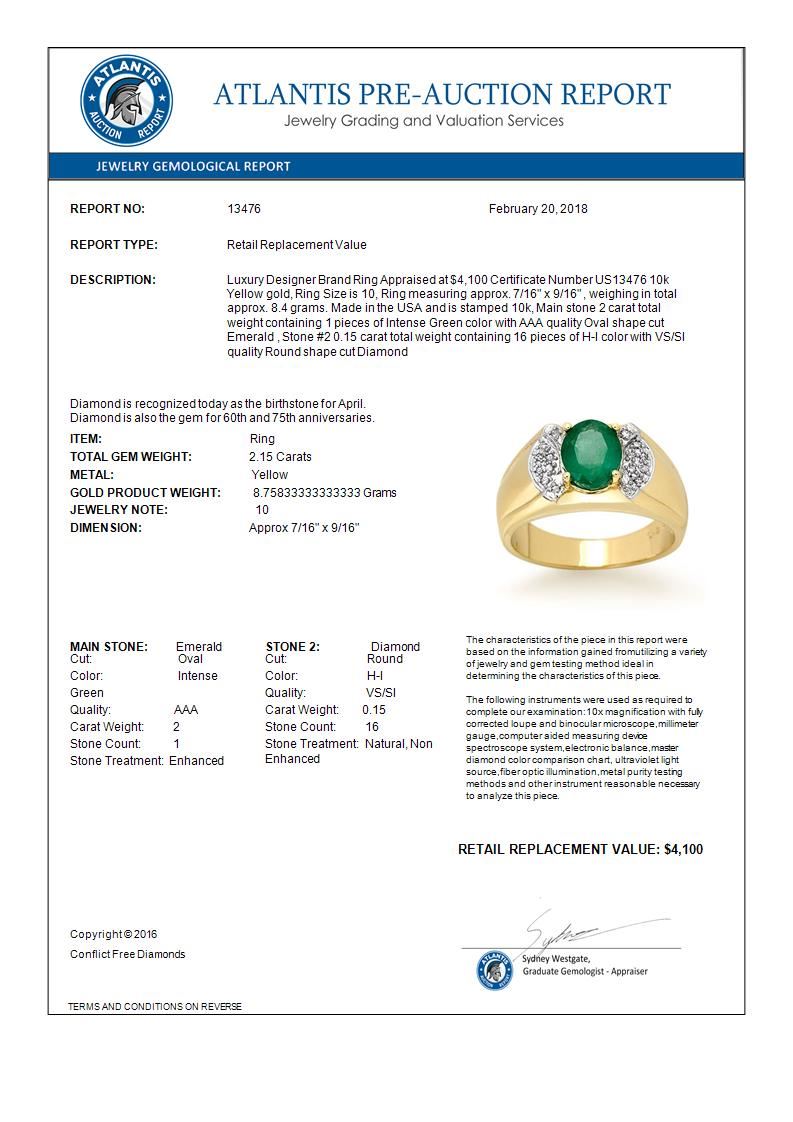REF-61A8X -13476 ---- 2.15 CTW Emerald & Diamond Men's Ring 10K Yellow Gold ---- Luxury Designer Brand Ring Appraised at $4,100 Certificate Number US13476 10k Yellow gold, Ring Size is 10, Ring measuring approx. 7/16" x 9/16" , weighing in total approx. 8.4 grams. Made in the USA and is stamped 10k, Main stone 2 carat total weight containing 1 pieces of Intense Green color with AAA quality Oval shape cut Emerald , Stone #2 0.15 carat total weight containing 16 pieces of H-I color with VS/SI quality Round shape cut Diamond
