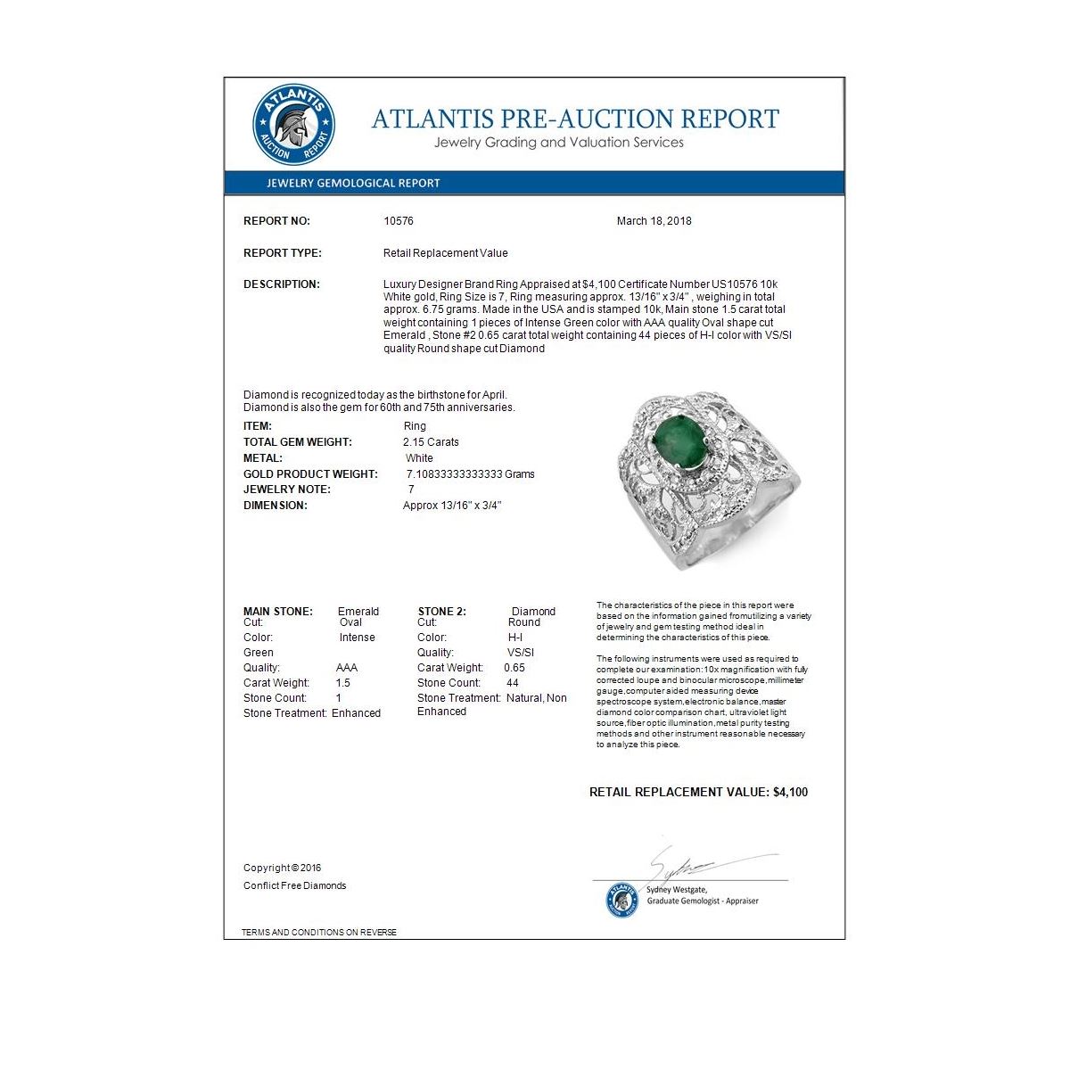 REF-62Y2K -10576 ---- 2.15 CTW Emerald & Diamond Ring 10K White Gold ---- Luxury Designer Brand Ring Appraised at $4,100 Certificate Number US10576 10k White gold, Ring Size is 7, Ring measuring approx. 13/16" x 3/4" , weighing in total approx. 6.75 grams. Made in the USA and is stamped 10k, Main stone 1.5 carat total weight containing 1 pieces of Intense Green color with AAA quality Oval shape cut Emerald , Stone #2 0.65 carat total weight containing 44 pieces of H-I color with VS/SI quality Round shape cut Diamond
