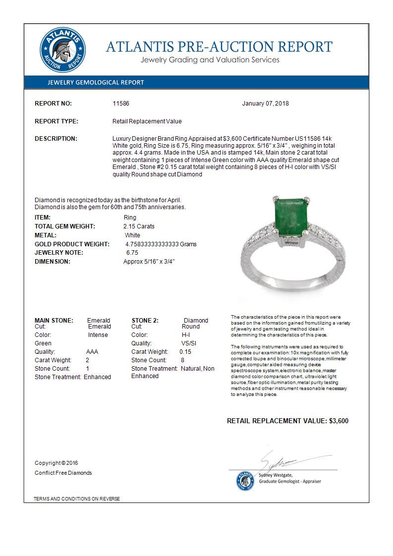 REF-54H5A -11586 ---- 2.15 CTW Emerald & Diamond Ring 14K White Gold ---- Luxury Designer Brand Ring Appraised at $3,600 Certificate Number US11586 14k White gold, Ring Size is 6.75, Ring measuring approx. 5/16" x 3/4" , weighing in total approx. 4.4 grams. Made in the USA and is stamped 14k, Main stone 2 carat total weight containing 1 pieces of Intense Green color with AAA quality Emerald shape cut Emerald , Stone #2 0.15 carat total weight containing 8 pieces of H-I color with VS/SI quality Round shape cut Diamond