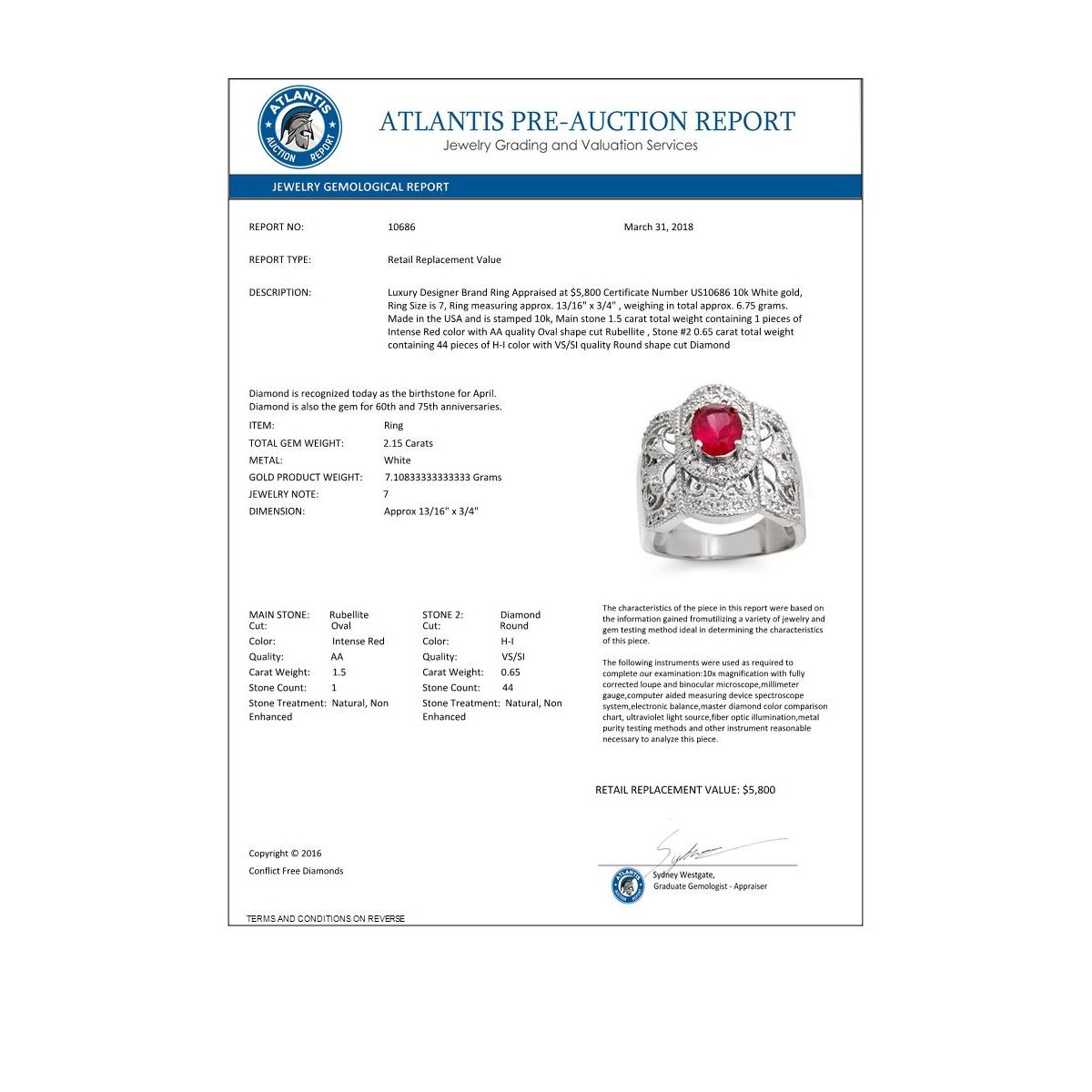 REF-75W3F -10686 ---- 2.15 CTW Rubellite & Diamond Ring 10K White Gold ---- Luxury Designer Brand Ring Appraised at $5,800 Certificate Number US10686 10k White gold, Ring Size is 7, Ring measuring approx. 13/16" x 3/4" , weighing in total approx. 6.75 grams. Made in the USA and is stamped 10k, Main stone 1.5 carat total weight containing 1 pieces of Intense Red color with AA quality Oval shape cut Rubellite , Stone #2 0.65 carat total weight containing 44 pieces of H-I color with VS/SI quality Round shape cut Diamond
