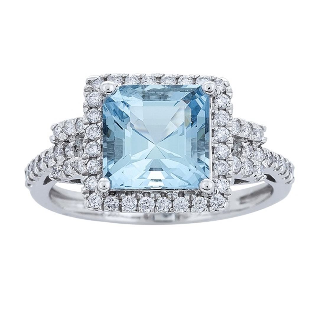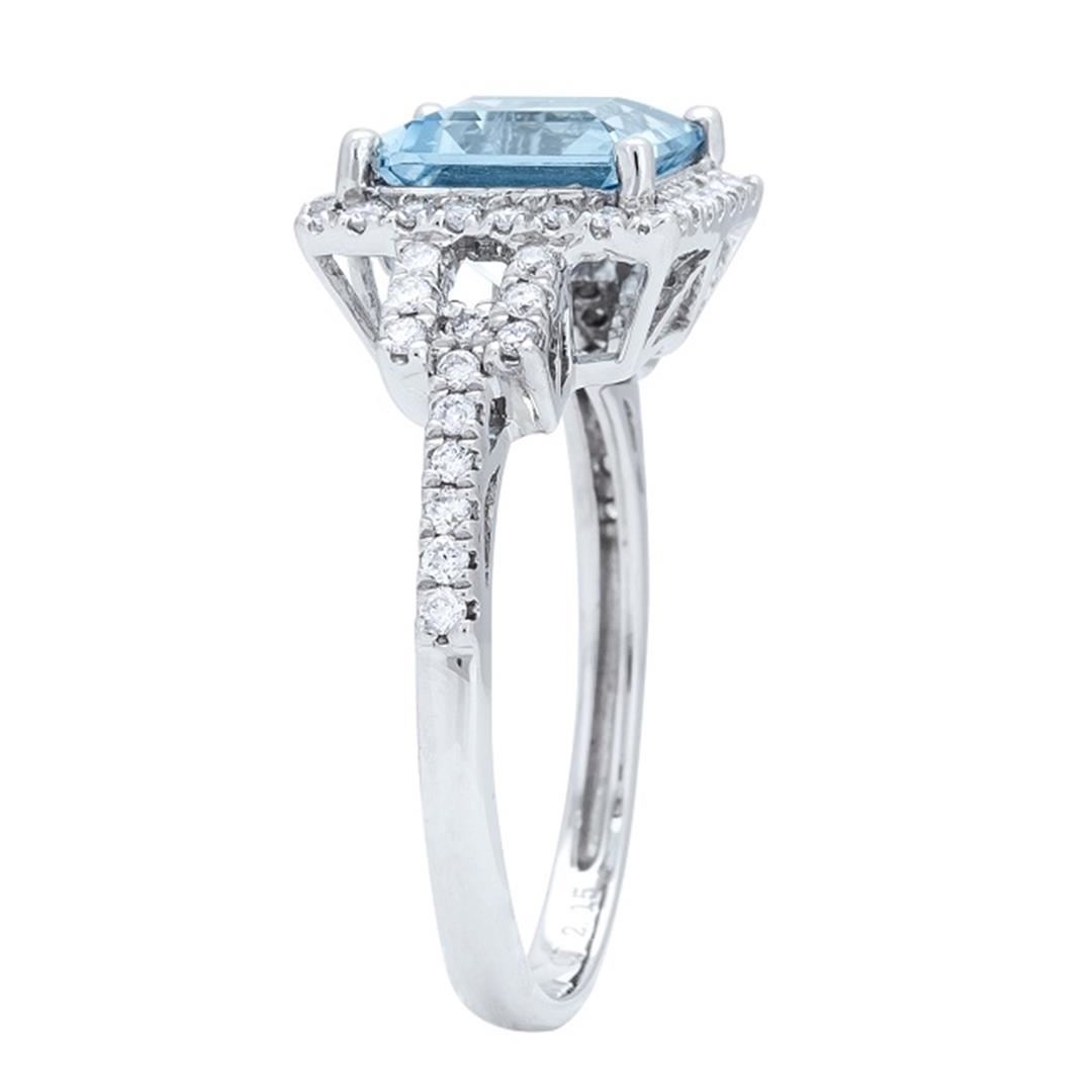 One Aquamarine and Diamond Ring featuring: 14KT White Gold with a total weight of 3.03 grams, Aquamarine with a total weight of 2.15ct, and 54 Round Cut Diamonds with a total weight of 0.39ctw.