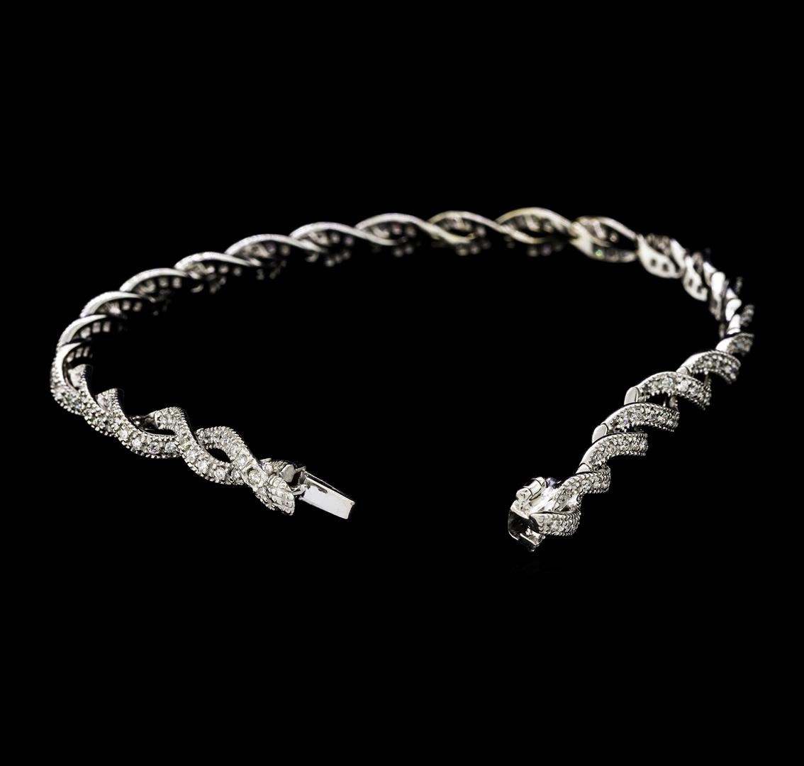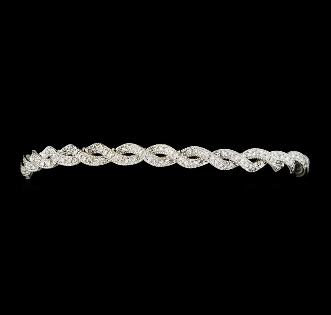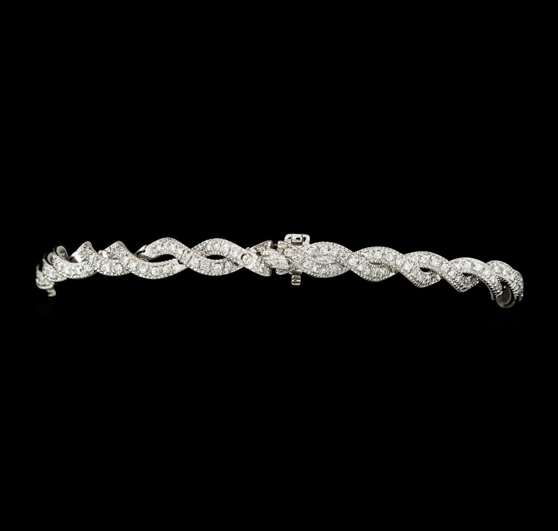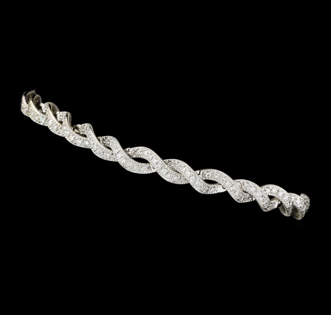 One electronically tested 18KT white gold lady's combination cast & assembled fashion bracelet with a tongue clasp with foldover safety with a bright polish with milgrain detailing finish. The featured lady's bracelet has an overlapping wave motif and measures approximately 7.5 inches in length. Identified with markings of '750'. Condition is new, good workmanship. Containing: Two Hundred Thirty-One prong set round brilliant cut diamonds, measuring 1.40 - 1.30 x 0.84mm (depth est.) approximate total weight of 231 Stones = 2.15ct. Graded in the setting. Color H - I Clarity VS-2 to SI-1 Cut Very Good. Total Weight of Diamonds 2.15ct.. Total Weight of Bracelet 13.30gm GAS Appraised at $7930.00. GAS Appraised at $7,930.00.
