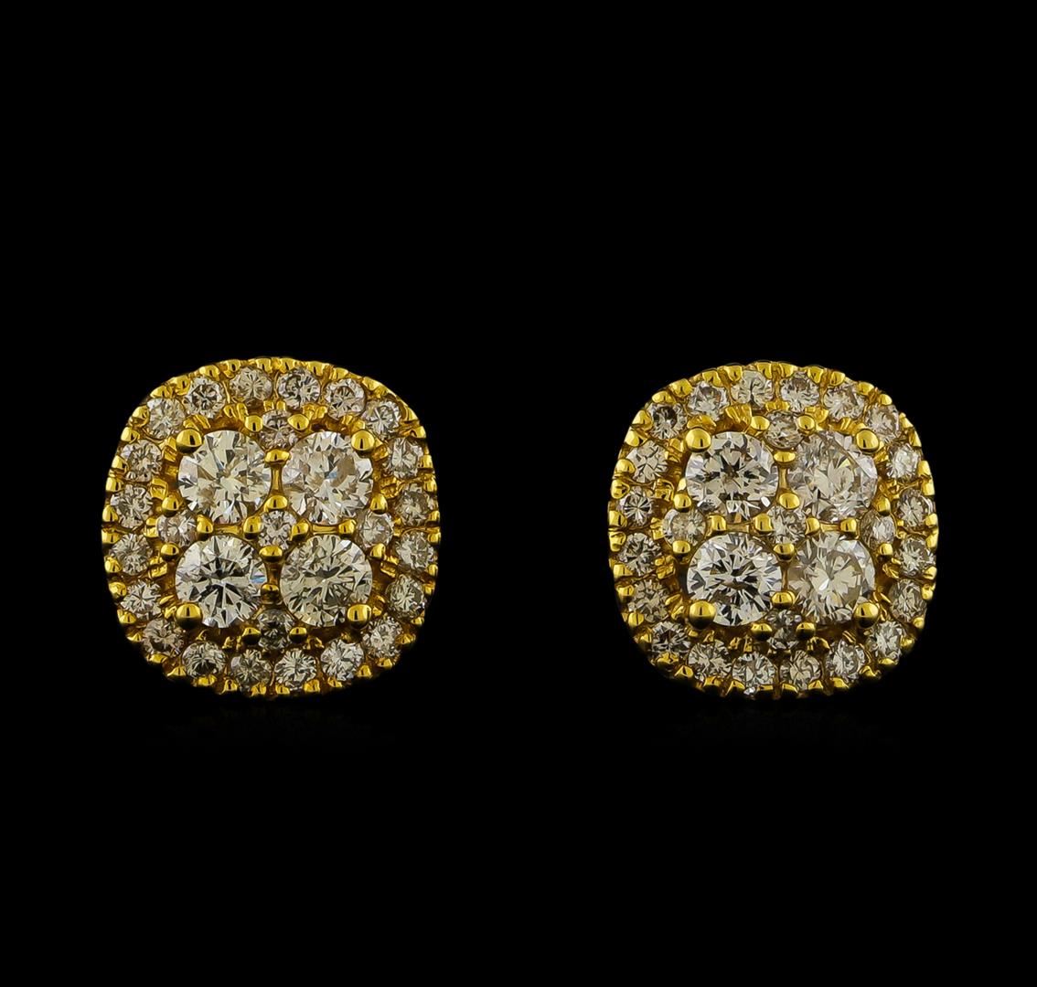 One pair electronically tested 14KT yellow gold cast & assembled diamond earrings with screw backs. Each earring features an organized diamond cluster set within a diamond bezel and supported by a lattice under gallery. Bright polish finish. Identified with markings of "14K". Condition is new, good workmanship. Containing: Eight prong set round brilliant cut diamonds, measuring 3.50 - 3.40 x 2.07mm (depth est.) approximate total weight of 8 Stones = 1.25ct. Graded in the setting. Clarity: SI-2 to I-1. Color: F - G Fifty prong set round brilliant cut diamonds, measuring 1.70 - 1.60 x 0.99mm (depth est.) approximate total weight of 50 Stones = 0.90ct. Graded in the setting. Clarity: SI-1 to SI-2. Color: F - H. Total Weight of Diamonds 2.15ct. Total Weight of Earrings 5.54gm. AIG Appraised at $8,405.00.