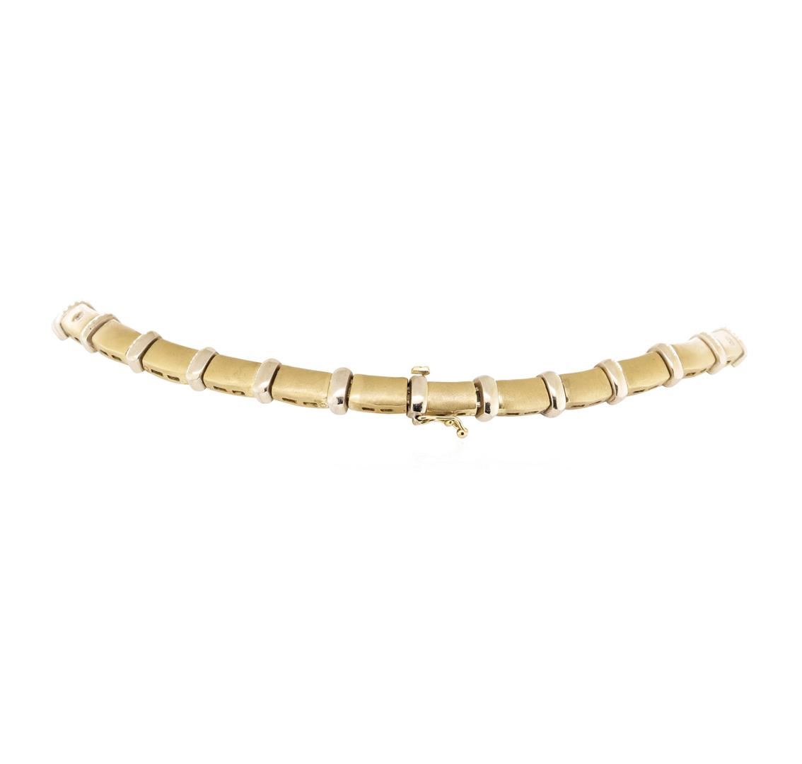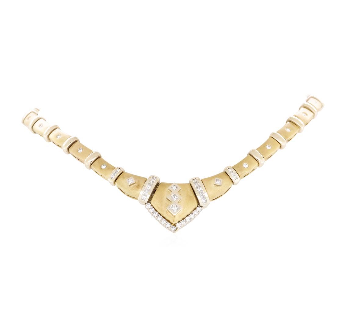 One electronically tested 14KT yellow and white gold lady's combination cast & assembled fashion necklace with a tongue clasp with foldover safety with a bright polish and satin finish. The featured lady's necklace measures approximately fifteen inches in length. Identified with markings of '14K'. Condition is used, good workmanship. Containing: One bezel set princess cut diamond, measuring 3.30 x 3.20 x 2.40mm (depth est.) approximate weight of 0.20ct. Graded in the setting. Color H Clarity VS-1 Cut Very Good Fourteen channel set princess cut diamonds, measuring 2.50 x 2.30 x 1.73mm (depth est.) approximate total weight of 14 Stones = 1.15ct. Graded in the setting. Color H - I Clarity VS-2 to SI-1 Cut Very Good Six channel set princess cut diamonds, measuring 1.80 x 1.70 x 1.28mm (depth est.) approximate total weight of 6 Stones = 0.20ct. Graded in the setting. Color H - I Clarity SI-1 to SI-2 Cut Good Fourteen bezel set round brilliant cut diamonds, measuring 2.30 - 2.20 x 1.40mm (depth est.) approximate total weight of 14 Stones = 0.60ct. Graded in the setting. Color G - H Clarity VS-1 to VS-2 Cut Very Good. Total Weight of Diamonds 2.15ct.. Total Weight of Necklace 53.40gm GAS Appraised at $10280.00. GAS Appraised at $10,280.00.