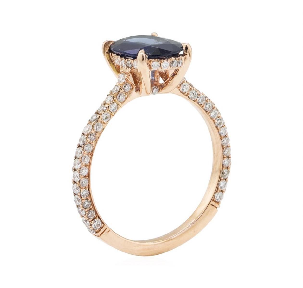 One electronically tested 14KT rose gold lady's cast fashion ring with a straight line with a bright polish finish. The featured lady's ring has a shank measuring 1.65 millimeters wide. Identified with markings of '14K'. Condition is new, good workmanship. Containing: One prong set oval modified mixed cut natural blue sapphire, measuring 8.92 x 6.92 x 2.80mm, (depth est.) approximate weight of 1.45ct., clarity is heavily included, medium dark, very slightly grayish, blue color, (GIA B 6/3), cut is very good. Transmitting light somewhat diffusely, semi-transparent to translucent. Naturally occurring internal & external characteristics are present. Colored gemstones are presumed to have been subjected to commonly used enhancement processes. Graded in the setting. Eighty-Six prong set round brilliant cut diamonds, measuring 1.25 - 1.20 x 0.76mm (depth est.) approximate total weight of 86 Stones = 0.63ct. Graded in the setting. Color G - H Clarity VS-2 to SI-1 Cut Good Twenty prong set round brilliant cut diamonds, measuring 1.00 - 0.95 x 0.61mm (depth est.) approximate total weight of 20 Stones = 0.07ct. Graded in the setting. Color G - H Clarity VS-2 to SI-2 Cut Very Good. Total Weight of Colored Stones 1.45ct.. Total Weight of Diamonds 0.70 ct.. Total Weight of Ring 2.40gm GAS Appraised at $3740.00. GAS Appraised.