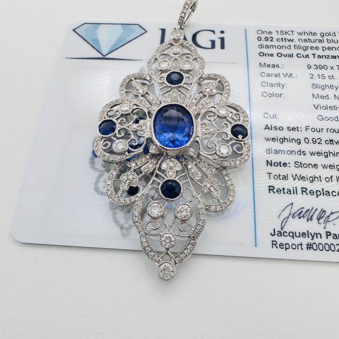 This intricate 18K white gold filigree pendant features one oval cut tanzanite measuring 9.390 x 7.180 x 4.540 mm, weighing 2.15 ct, with slightly included clarity and a medium moderately strong yellowish blue color, exhibiting a Good cut. Also set are four round cut blue sapphires weighing 0.92 cttw, and 207 round brilliant cut diamonds weighing 1.19 cttw. The total item weight is 7.000 gm.