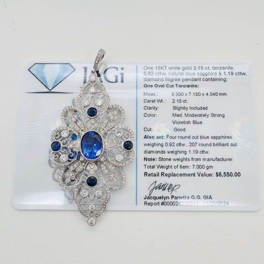 This intricate 18K white gold filigree pendant features one oval cut tanzanite measuring 9.390 x 7.180 x 4.540 mm, weighing 2.15 ct, with slightly included clarity and a medium moderately strong yellowish blue color, exhibiting a Good cut. Also set are four round cut blue sapphires weighing 0.92 cttw, and 207 round brilliant cut diamonds weighing 1.19 cttw. The total item weight is 7.000 gm.