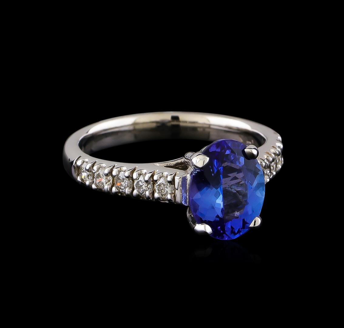 One electronically tested 14KT white gold ladies cast tanzanite and diamond ring with a bright polish finish. The featured tanzanite is supported by diamond ribbon shoulders, completed by a two and one-half millimeter wide band. Identified with markings of "14K". Condition is new, good workmanship. Containing: One prong set oval mixed cut natural tanzanite, measuring 9.40 x 7.40 x 4.40mm, approximate weight of 2.15ct., clarity is eye clean, type I, medium, slightly grayish, violetish blue color, (GIA vB 5/2), cut is good. Transmitting light with no distortion, transparent. Graded in the setting. Tanzanite is a very rare gemstone that is only found in the country of Tanzania. Originally discovered in 1967. Tiffany & Company, named the stone Tanzanite. It is found in the Usumburu Mountains that border the Umba Valley of northern Tanzania. Tanzanite occurs in gray, brown, violet, blue, reddish-purple, & green. The gem is interesting because of its exceptional pleochroism. Rotated in different directions a tanzanite will exhibit multiple changes of color. Tanzanite has a low tolerance to ultrasonic cleaning, and should not be cleaned using this method. Ten prong set round brilliant cut diamonds, measuring 2.20 - 2.10 x 1.29mm (depth est.) approximate total weight of 10 Stones = 0.36ct. Graded in the setting. Clarity: I-1 to I-2. Color: G - I. Total Weight of Colored Stones 2.15ct. Total Weight of Diamonds 0.36ct. Total Weight of Ring 4.41gm. AIG Appraised at $5,340.00.