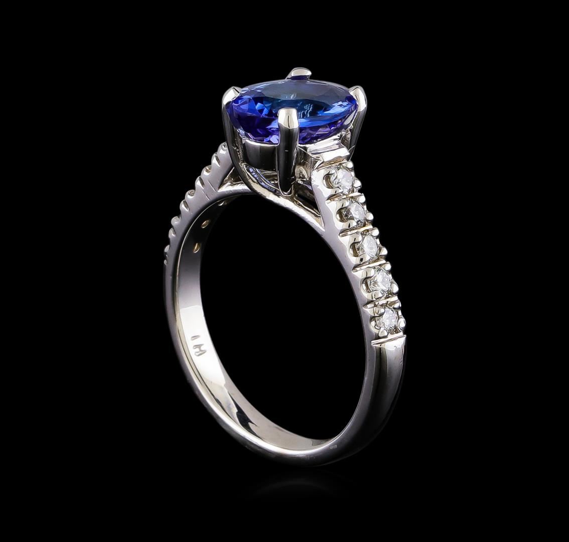 One electronically tested 14KT white gold ladies cast tanzanite and diamond ring with a bright polish finish. The featured tanzanite is supported by diamond ribbon shoulders, completed by a two and one-half millimeter wide band. Identified with markings of "14K". Condition is new, good workmanship. Containing: One prong set oval mixed cut natural tanzanite, measuring 9.40 x 7.40 x 4.40mm, approximate weight of 2.15ct., clarity is eye clean, type I, medium, slightly grayish, violetish blue color, (GIA vB 5/2), cut is good. Transmitting light with no distortion, transparent. Graded in the setting. Tanzanite is a very rare gemstone that is only found in the country of Tanzania. Originally discovered in 1967. Tiffany & Company, named the stone Tanzanite. It is found in the Usumburu Mountains that border the Umba Valley of northern Tanzania. Tanzanite occurs in gray, brown, violet, blue, reddish-purple, & green. The gem is interesting because of its exceptional pleochroism. Rotated in different directions a tanzanite will exhibit multiple changes of color. Tanzanite has a low tolerance to ultrasonic cleaning, and should not be cleaned using this method. Ten prong set round brilliant cut diamonds, measuring 2.20 - 2.10 x 1.29mm (depth est.) approximate total weight of 10 Stones = 0.36ct. Graded in the setting. Clarity: I-1 to I-2. Color: G - I. Total Weight of Colored Stones 2.15ct. Total Weight of Diamonds 0.36ct. Total Weight of Ring 4.41gm. AIG Appraised at $5,340.00.