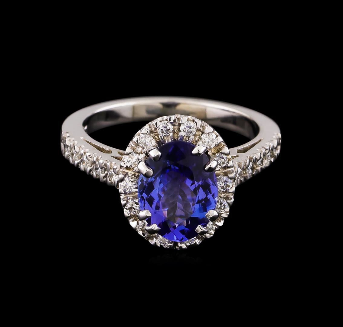 One electronically tested 14KT white gold lady's cast fashion ring with a cathedral halo with a bright polish finish. The featured lady's ring has a shank measuring 2.25 millimeters wide. Identified with markings of "14K". Condition is new, good workmanship. Containing: One prong set oval modified brilliant cut natural tanzanite, measuring 9.57 x 7.40 x 4.28mm, approximate weight of 2.15ct., clarity is eye clean, medium, very slightly grayish, bluish violet color, (GIA bV 5/3), cut is good. Transmitting light with no distortion, transparent. Colored gemstones are presumed to have been subjected to commonly used enhancement processes. Graded in the setting. Twenty-Four prong set round brilliant cut diamonds, measuring 1.60 - 1.50 x 0.96mm (depth est.) approximate total weight of 24 Stones = 0.35ct. Graded in the setting. Clarity: VS-2 to SI-2. Color: H - I. Cut Good. Total Weight of Colored Stones 2.15ct. Total Weight of Diamonds 0.35ct. Total Weight of Ring 5.80gm. GAS Appraised at $4,530.00.