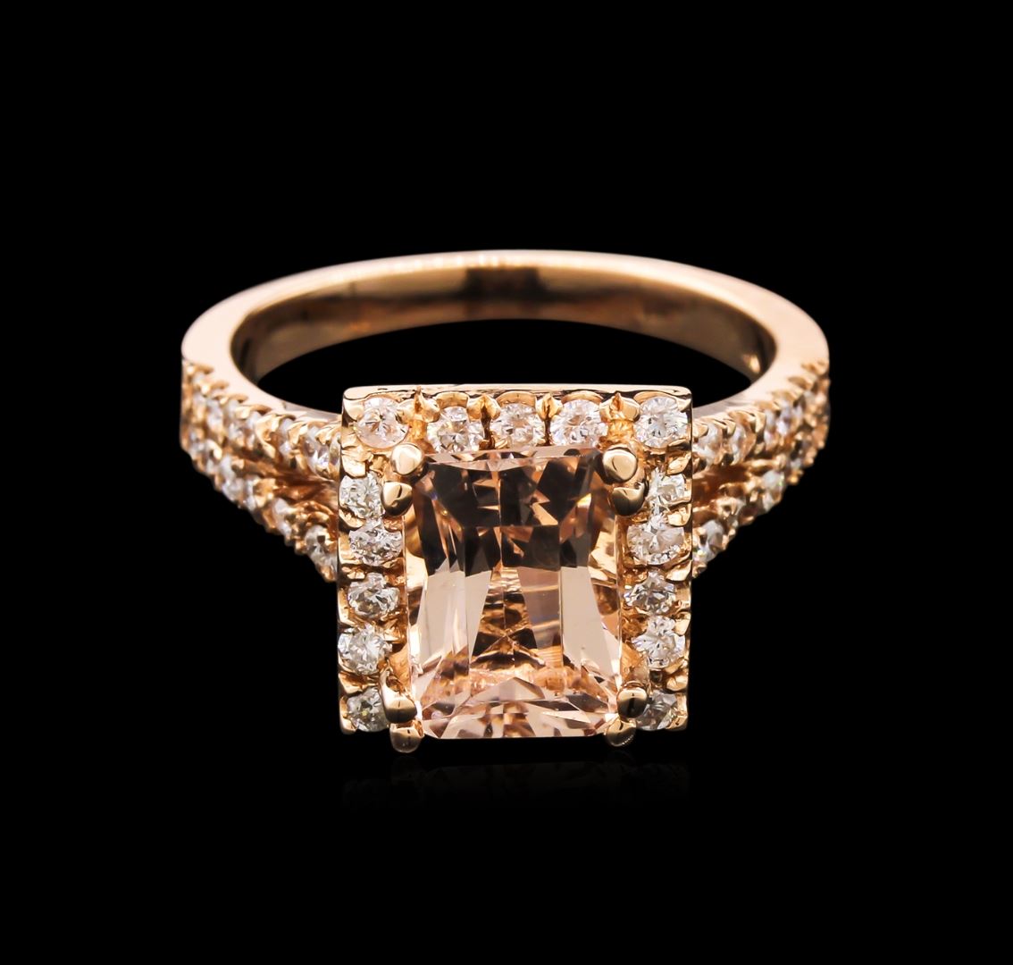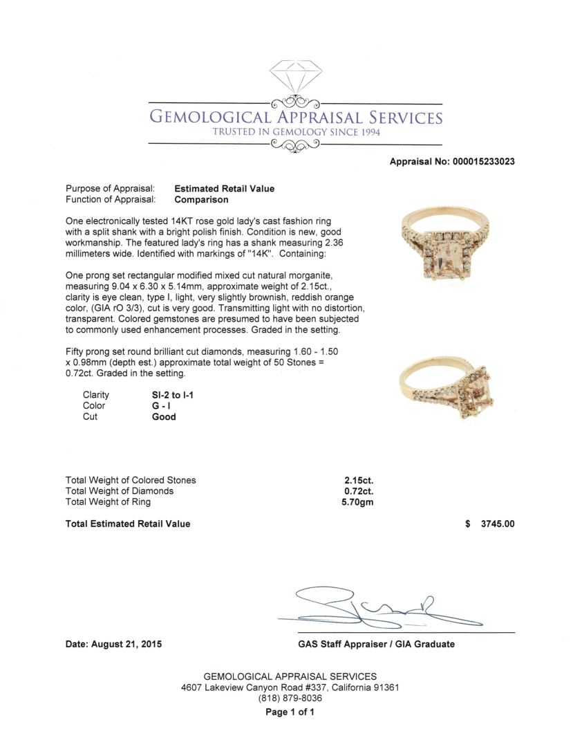 One electronically tested 14KT rose gold lady's cast fashion ring with a split shank with a bright polish finish. The featured lady's ring has a shank measuring 2.36 millimeters wide. Identified with markings of "14K". Condition is new, good workmanship. Containing: One prong set rectangular modified mixed cut natural morganite, measuring 9.04 x 6.30 x 5.14mm, approximate weight of 2.15ct., clarity is eye clean, type I, light, very slightly brownish, reddish orange color, (GIA rO 3/3), cut is very good. Transmitting light with no distortion, transparent. Colored gemstones are presumed to have been subjected to commonly used enhancement processes. Graded in the setting. Fifty prong set round brilliant cut diamonds, measuring 1.60 - 1.50 x 0.98mm (depth est.) approximate total weight of 50 Stones = 0.72ct. Graded in the setting. Clarity: SI-2 to I-1. Color: G - I. Cut Good. Total Weight of Colored Stones 2.15ct. Total Weight of Diamonds 0.72ct. Total Weight of Ring 5.70gm. GAS Appraised at $3,745.00.
